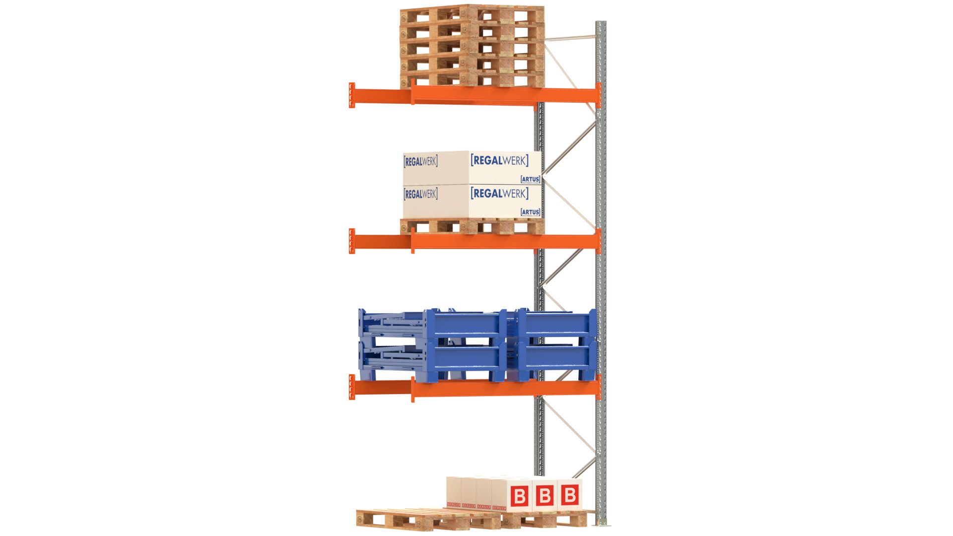 ARTUS-Palettenregal - Anbaufeld - 3800-3 HxBxT 4500 x 1985 x 1100 mm mit 3 x Ebenen Auflageträger Variante 1900-125/1,5 - RAL 2004 Stützrahmen NCS S 4005 (ähnlich - RAL 7001 silbergrau) (Ausfachung verzinkt) Fachlast: 3.000 kg Feldlast: 9.000 kg bei max. Fachhöhe von 1.300 mm jeweils bei gleichmässig verteilter Last inkl. Bolzenanker