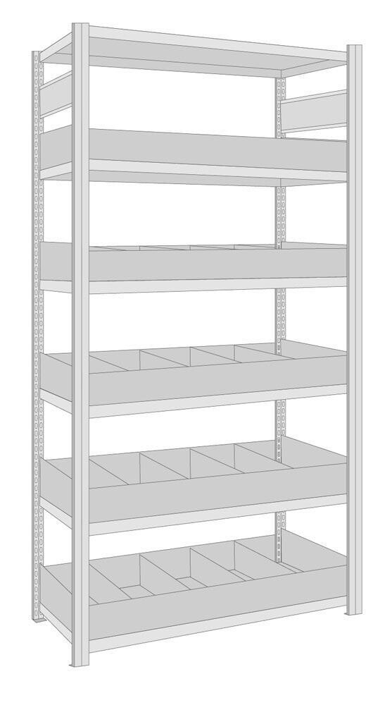 · 5 Fachebenen mit je 1 Schüttenset ausgestattet · Schüttenset bestehend bei Grundfeld aus 4 Stecktrennwänden und 1 Schüttenabschluss-Paar, bei Anbaufeld mit 4 Stecktrennwänden und 1 Schüttenabschluss · 1 Fachebene als Stahlfachboden als Abdeckung · Schüttgutleisten auf den Stahlfachboden steckbar · Stecktrennwände in Stecklaschen variabel einsetzbar · Abschlüsse rechts und links werden im Rahmen eingesetzt · Alle Komponenten aus verzinktem Stahlblech