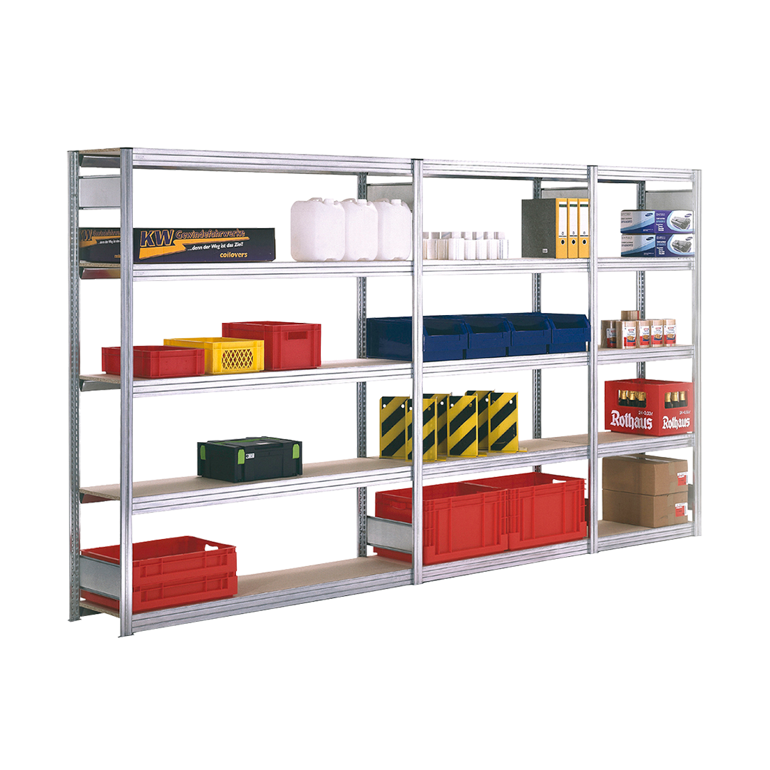 Dieses Schnellbausystem ist auf die Einlagerung von leichten und mittleren Lasten ausgelegt. Seine schnelle und einfache Montage wird durch weitgehend steckbare Regalkomponenten möglich. Es ist ein universell einsetzbares Fachbodenregal für alle Anwendungen in Lager, Büro und Archiv und überzeugt durch vielfältige Funktionalität, modernes Design und einen hohen Qualitätsstandard.