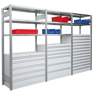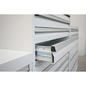 · Verschweißte Stahlblechkonstruktion, thermolackiert in RAL 7035 lichtgrau · Verschließbar über Zentralverriegelung · Vollauszug · Traglast 50 kg (bei gleichmäßig verteilter Last) ∙ Nutzfläche B x T 900 x 400 mm · Griffleiste mit Beschriftungsstreifen