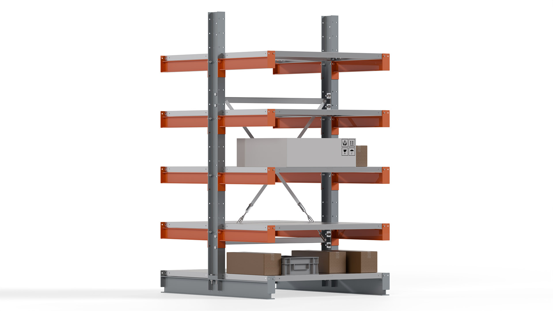 Das Kragarmregal zeichnet sich durch eine beständige und widerstandsfähige Konstruktion aus. Gefertigt aus hochwertigem Stahl, werden Einzelkomponenten wie Ständerprofile, Ständerfüße, Kragarme und Ständerverbindungen zu einem stabilen Gesamtsystem verschraubt. Die sandgestrahlte Oberfläche der Stahlprofile ist in einem elektrostatischen Verfahren mit Industrielack in Silbergrau (RAL 7001) und Reinorange (RAL 2004) beschichtet.
