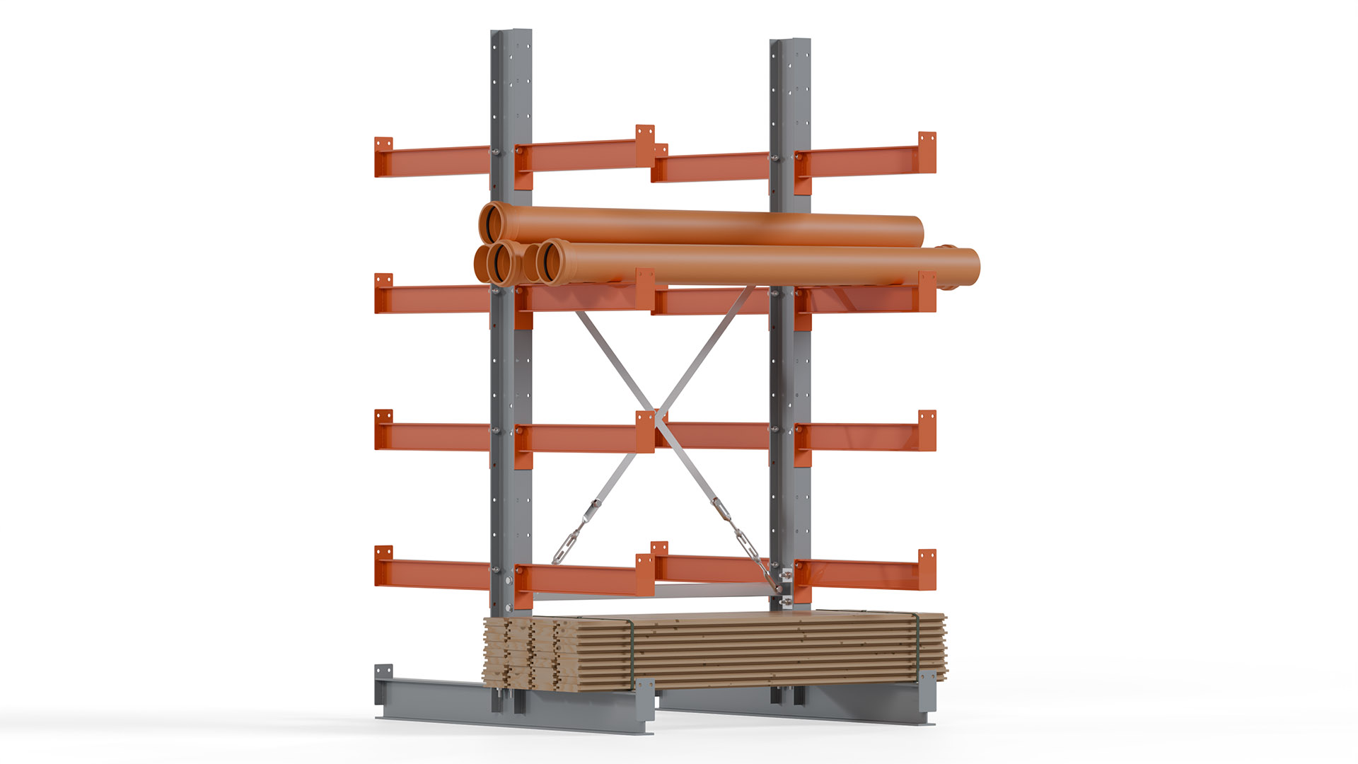 Das Kragarmregal zeichnet sich durch eine beständige und widerstandsfähige Konstruktion aus. Gefertigt aus hochwertigem Stahl, werden Einzelkomponenten wie Ständerprofile, Ständerfüße, Kragarme und Ständerverbindungen zu einem stabilen Gesamtsystem verschraubt. Die sandgestrahlte Oberfläche der Stahlprofile ist in einem elektrostatischen Verfahren mit Industrielack in Silbergrau (RAL 7001) und Reinorange (RAL 2004) beschichtet.