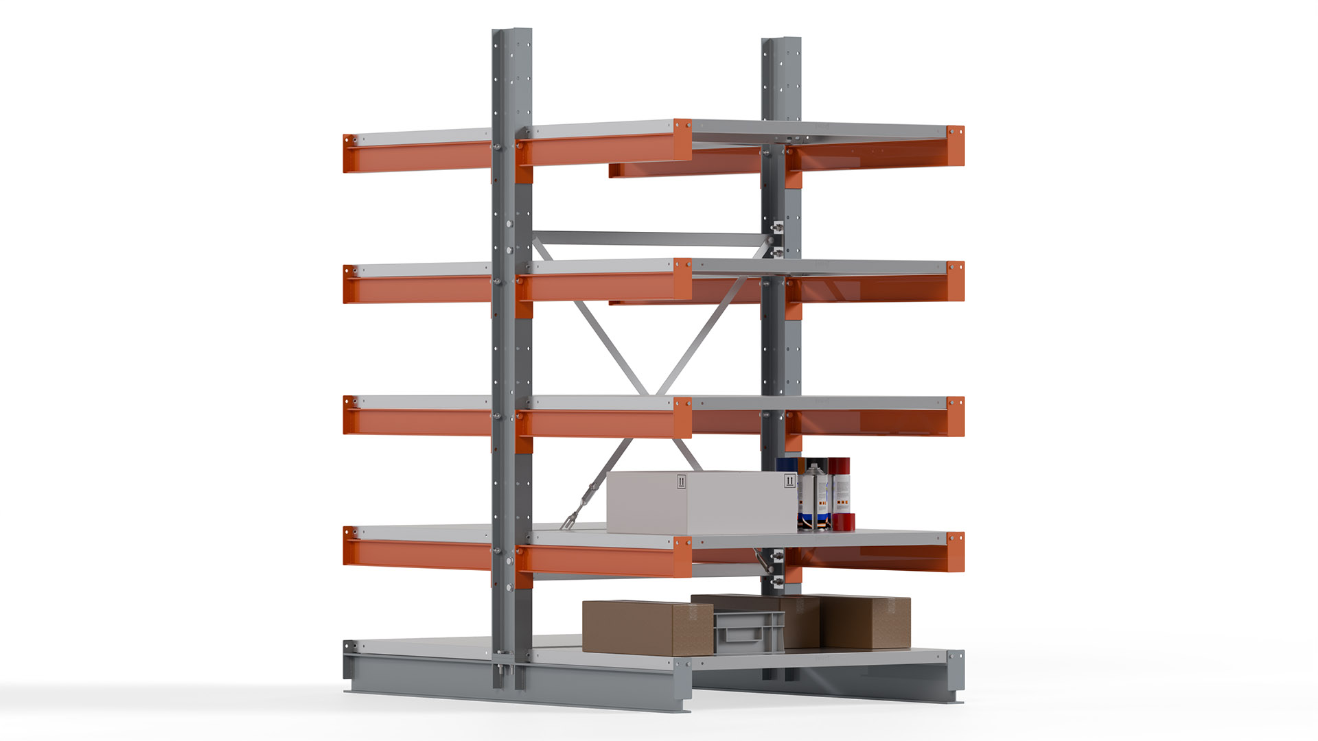 Das Kragarmregal zeichnet sich durch eine beständige und widerstandsfähige Konstruktion aus. Gefertigt aus hochwertigem Stahl, werden Einzelkomponenten wie Ständerprofile, Ständerfüße, Kragarme und Ständerverbindungen zu einem stabilen Gesamtsystem verschraubt. Die sandgestrahlte Oberfläche der Stahlprofile ist in einem elektrostatischen Verfahren mit Industrielack in Silbergrau (RAL 7001) und Reinorange (RAL 2004) beschichtet.