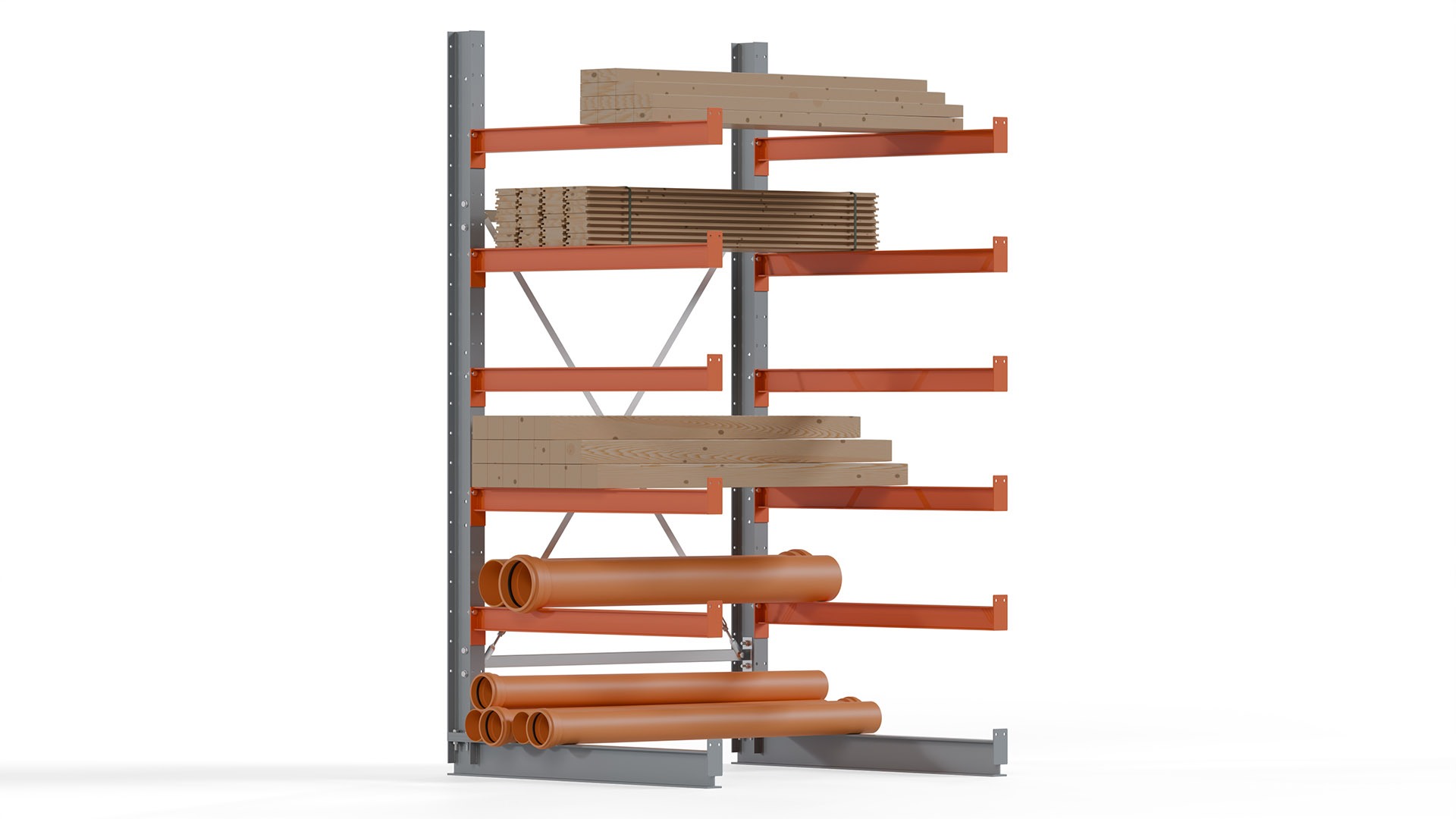 Das Kragarmregal zeichnet sich durch eine beständige und widerstandsfähige Konstruktion aus. Gefertigt aus hochwertigem Stahl, werden Einzelkomponenten wie Ständerprofile, Ständerfüße, Kragarme und Ständerverbindungen zu einem stabilen Gesamtsystem verschraubt. Die sandgestrahlte Oberfläche der Stahlprofile ist in einem elektrostatischen Verfahren mit Industrielack in Silbergrau (RAL 7001) und Reinorange (RAL 2004) beschichtet.