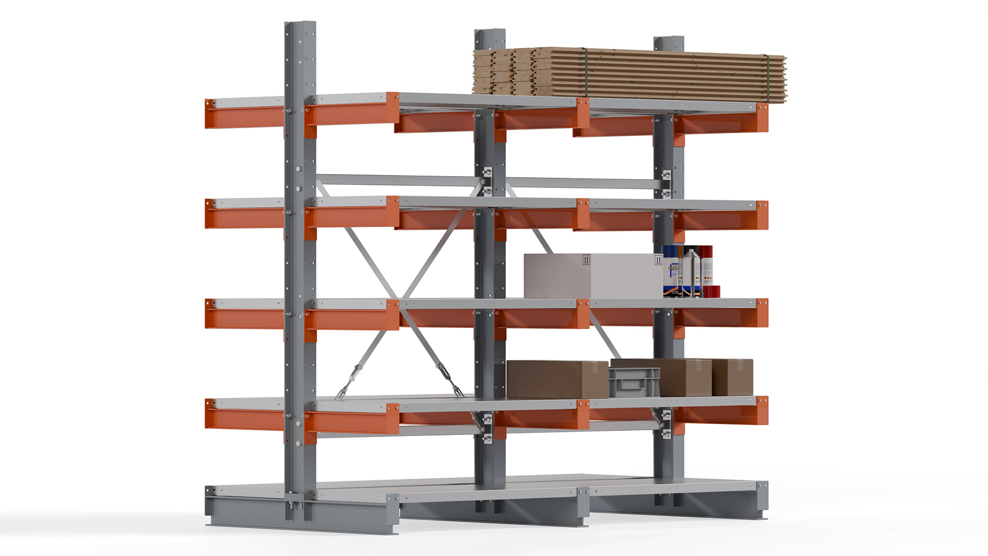Das Kragarmregal zeichnet sich durch eine beständige und widerstandsfähige Konstruktion aus. Gefertigt aus hochwertigem Stahl, werden Einzelkomponenten wie Ständerprofile, Ständerfüße, Kragarme und Ständerverbindungen zu einem stabilen Gesamtsystem verschraubt. Die sandgestrahlte Oberfläche der Stahlprofile ist in einem elektrostatischen Verfahren mit Industrielack in Silbergrau (RAL 7001) und Reinorange (RAL 2004) beschichtet.