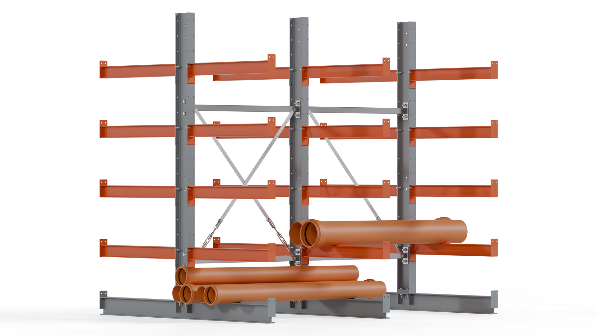 Das Kragarmregal zeichnet sich durch eine beständige und widerstandsfähige Konstruktion aus. Gefertigt aus hochwertigem Stahl, werden Einzelkomponenten wie Ständerprofile, Ständerfüße, Kragarme und Ständerverbindungen zu einem stabilen Gesamtsystem verschraubt. Die sandgestrahlte Oberfläche der Stahlprofile ist in einem elektrostatischen Verfahren mit Industrielack in Silbergrau (RAL 7001) und Reinorange (RAL 2004) beschichtet.