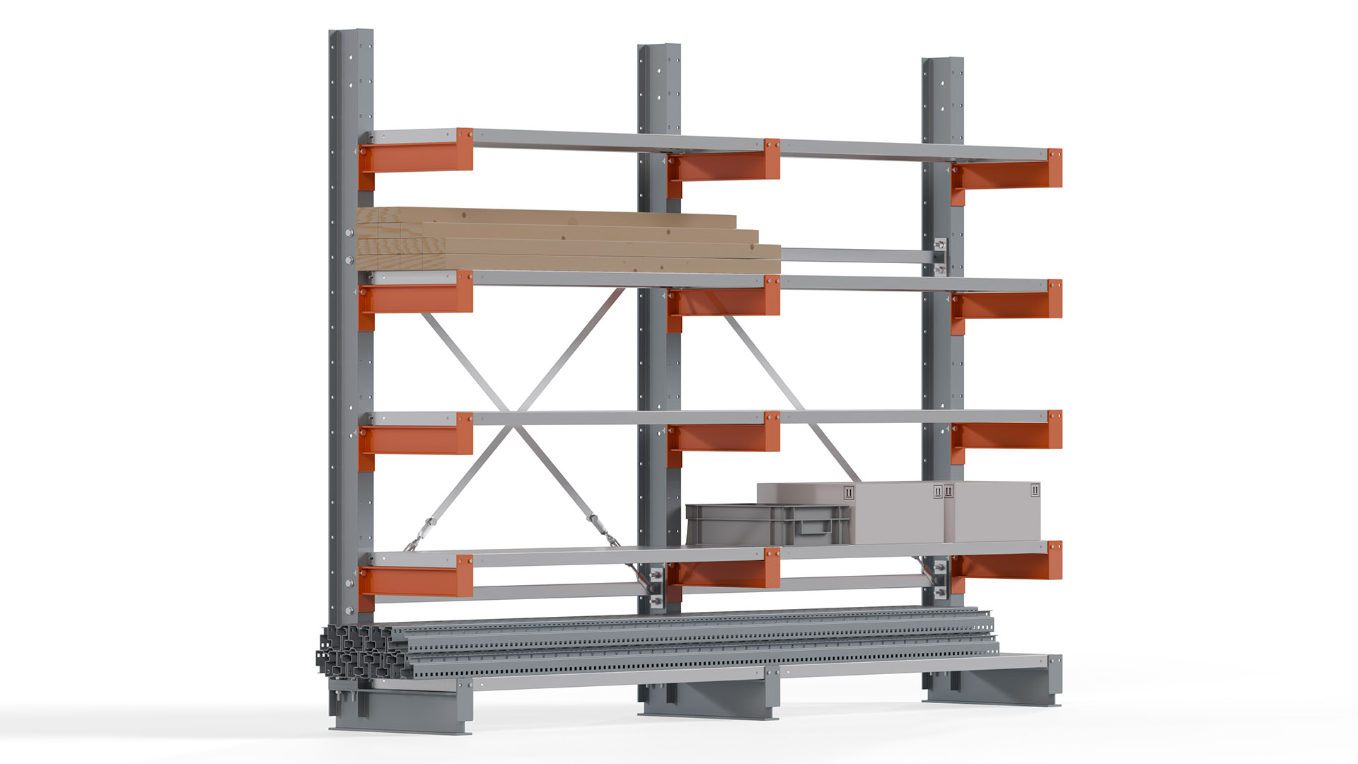 Das Kragarmregal zeichnet sich durch eine beständige und widerstandsfähige Konstruktion aus. Gefertigt aus hochwertigem Stahl, werden Einzelkomponenten wie Ständerprofile, Ständerfüße, Kragarme und Ständerverbindungen zu einem stabilen Gesamtsystem verschraubt. Die sandgestrahlte Oberfläche der Stahlprofile ist in einem elektrostatischen Verfahren mit Industrielack in Silbergrau (RAL 7001) und Reinorange (RAL 2004) beschichtet.