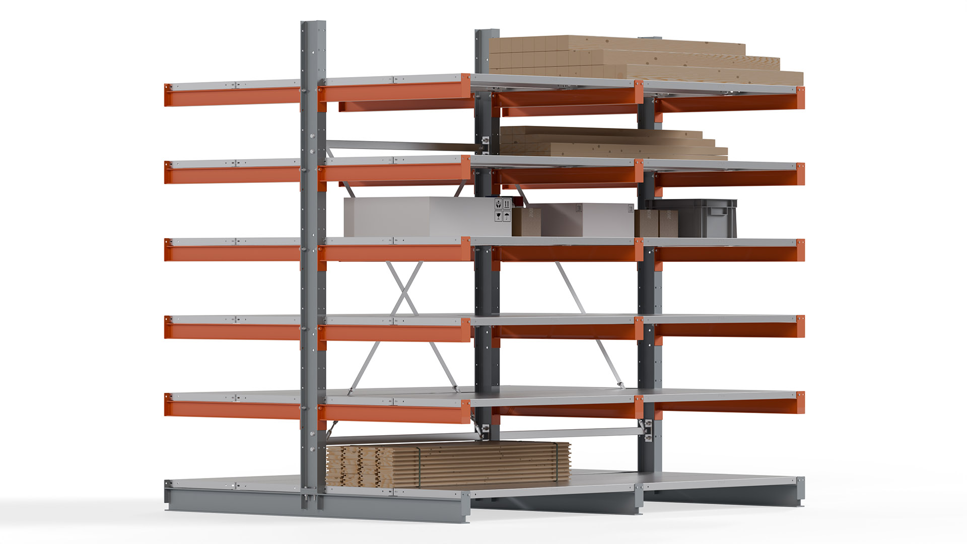 Das Kragarmregal zeichnet sich durch eine beständige und widerstandsfähige Konstruktion aus. Gefertigt aus hochwertigem Stahl, werden Einzelkomponenten wie Ständerprofile, Ständerfüße, Kragarme und Ständerverbindungen zu einem stabilen Gesamtsystem verschraubt. Die sandgestrahlte Oberfläche der Stahlprofile ist in einem elektrostatischen Verfahren mit Industrielack in Silbergrau (RAL 7001) und Reinorange (RAL 2004) beschichtet.