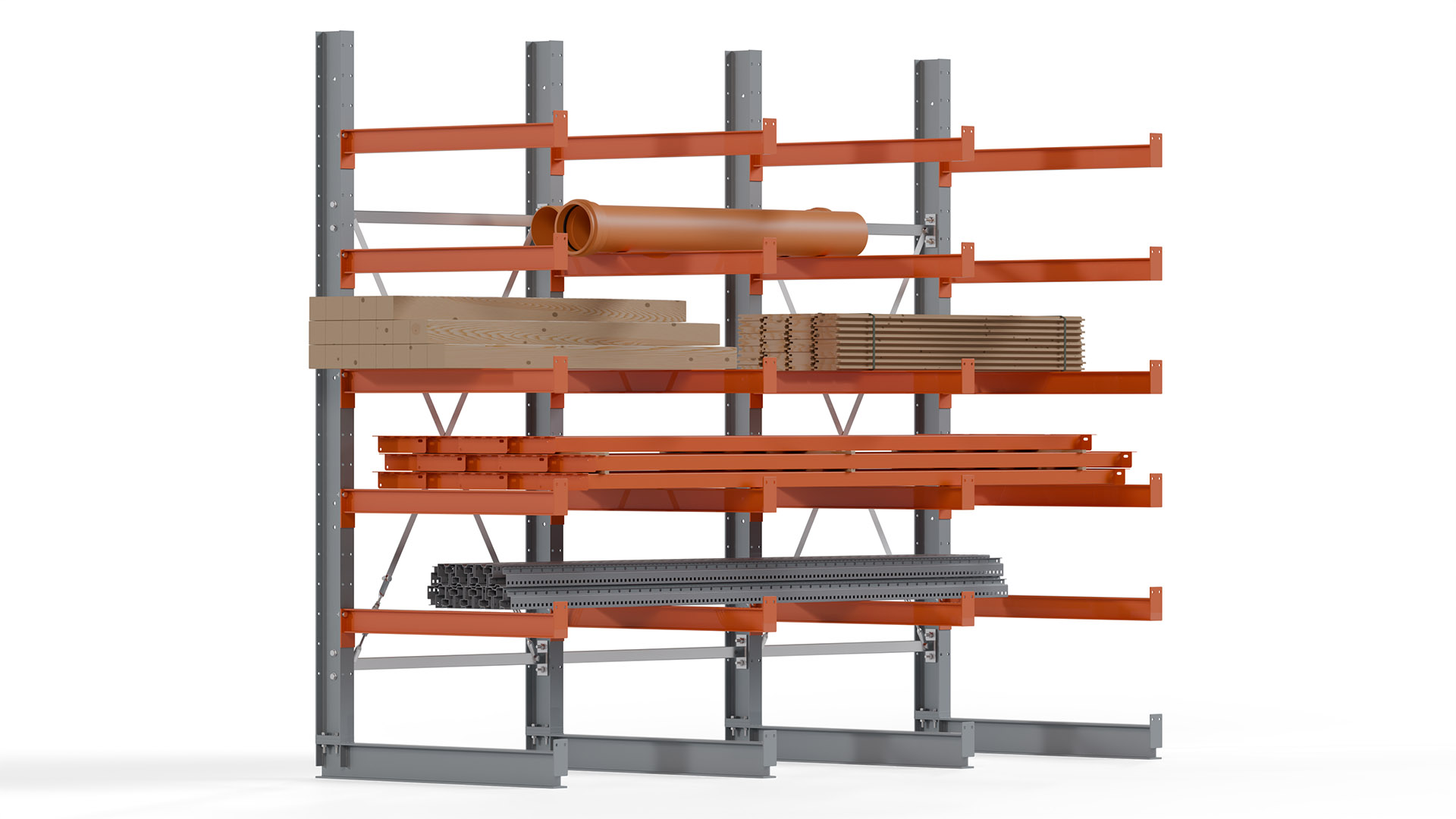 Das Kragarmregal zeichnet sich durch eine beständige und widerstandsfähige Konstruktion aus. Gefertigt aus hochwertigem Stahl, werden Einzelkomponenten wie Ständerprofile, Ständerfüße, Kragarme und Ständerverbindungen zu einem stabilen Gesamtsystem verschraubt. Die sandgestrahlte Oberfläche der Stahlprofile ist in einem elektrostatischen Verfahren mit Industrielack in Silbergrau (RAL 7001) und Reinorange (RAL 2004) beschichtet.