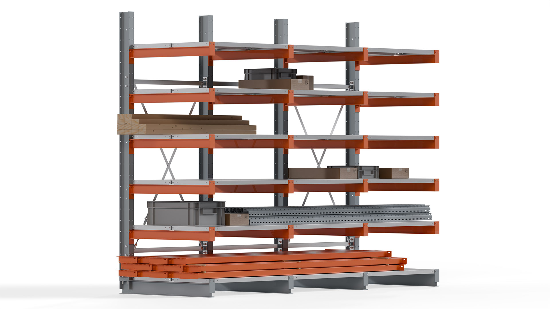 Das Kragarmregal zeichnet sich durch eine beständige und widerstandsfähige Konstruktion aus. Gefertigt aus hochwertigem Stahl, werden Einzelkomponenten wie Ständerprofile, Ständerfüße, Kragarme und Ständerverbindungen zu einem stabilen Gesamtsystem verschraubt. Die sandgestrahlte Oberfläche der Stahlprofile ist in einem elektrostatischen Verfahren mit Industrielack in Silbergrau (RAL 7001) und Reinorange (RAL 2004) beschichtet.
