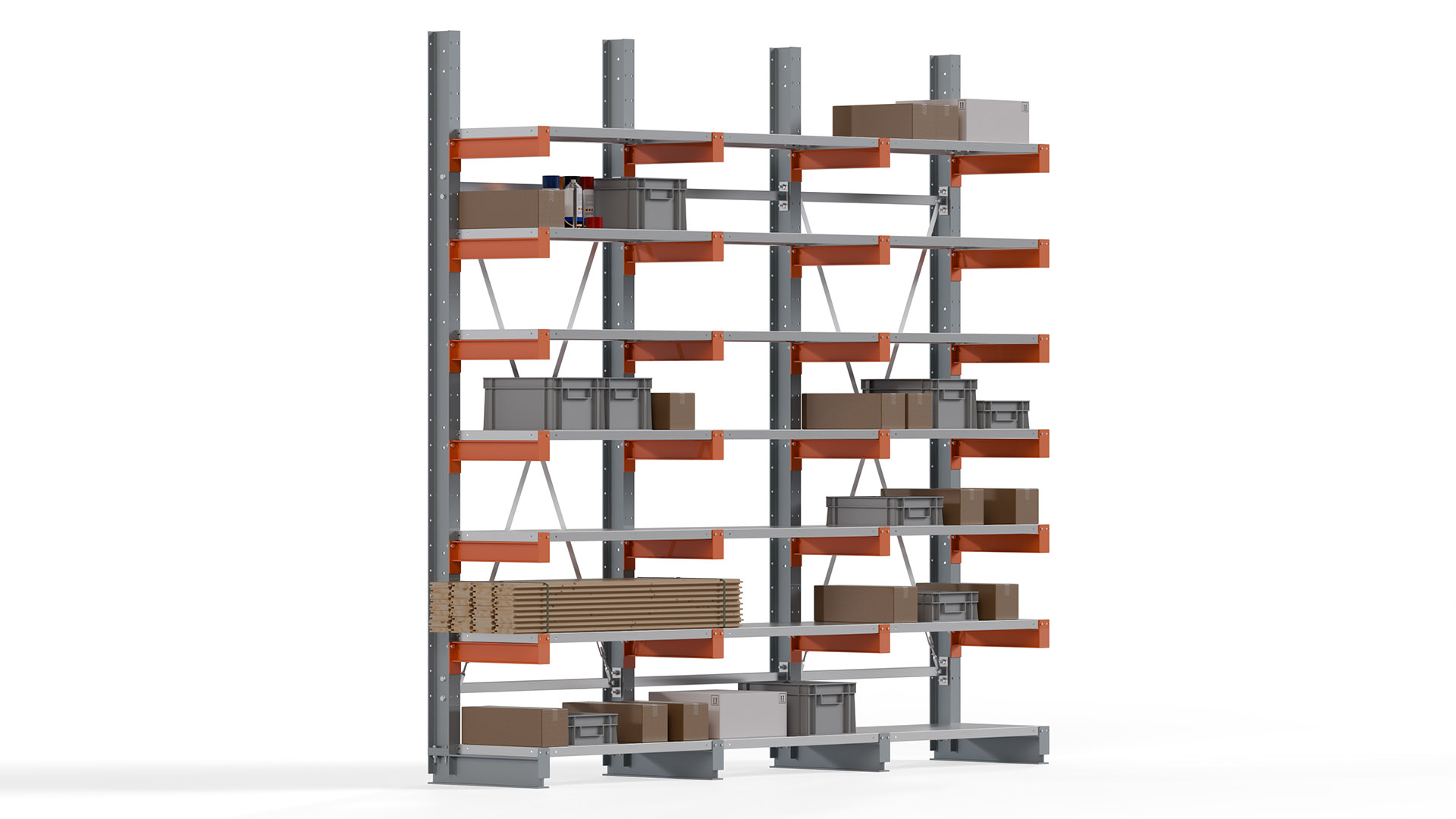 Das Kragarmregal zeichnet sich durch eine beständige und widerstandsfähige Konstruktion aus. Gefertigt aus hochwertigem Stahl, werden Einzelkomponenten wie Ständerprofile, Ständerfüße, Kragarme und Ständerverbindungen zu einem stabilen Gesamtsystem verschraubt. Die sandgestrahlte Oberfläche der Stahlprofile ist in einem elektrostatischen Verfahren mit Industrielack in Silbergrau (RAL 7001) und Reinorange (RAL 2004) beschichtet.