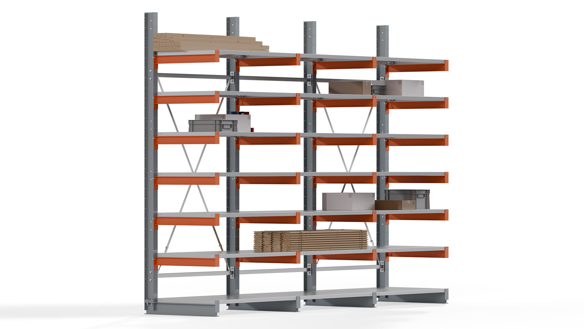 Das Kragarmregal zeichnet sich durch eine beständige und widerstandsfähige Konstruktion aus. Gefertigt aus hochwertigem Stahl, werden Einzelkomponenten wie Ständerprofile, Ständerfüße, Kragarme und Ständerverbindungen zu einem stabilen Gesamtsystem verschraubt. Die sandgestrahlte Oberfläche der Stahlprofile ist in einem elektrostatischen Verfahren mit Industrielack in Silbergrau (RAL 7001) und Reinorange (RAL 2004) beschichtet.
