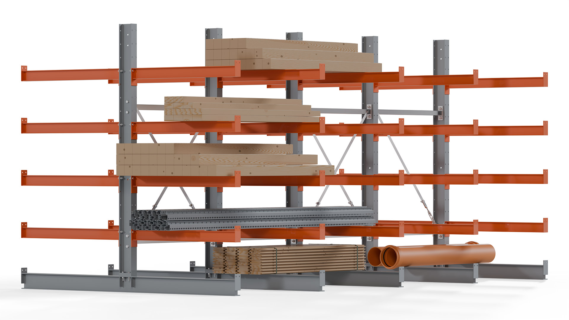 Das Kragarmregal zeichnet sich durch eine beständige und widerstandsfähige Konstruktion aus. Gefertigt aus hochwertigem Stahl, werden Einzelkomponenten wie Ständerprofile, Ständerfüße, Kragarme und Ständerverbindungen zu einem stabilen Gesamtsystem verschraubt. Die sandgestrahlte Oberfläche der Stahlprofile ist in einem elektrostatischen Verfahren mit Industrielack in Silbergrau (RAL 7001) und Reinorange (RAL 2004) beschichtet.