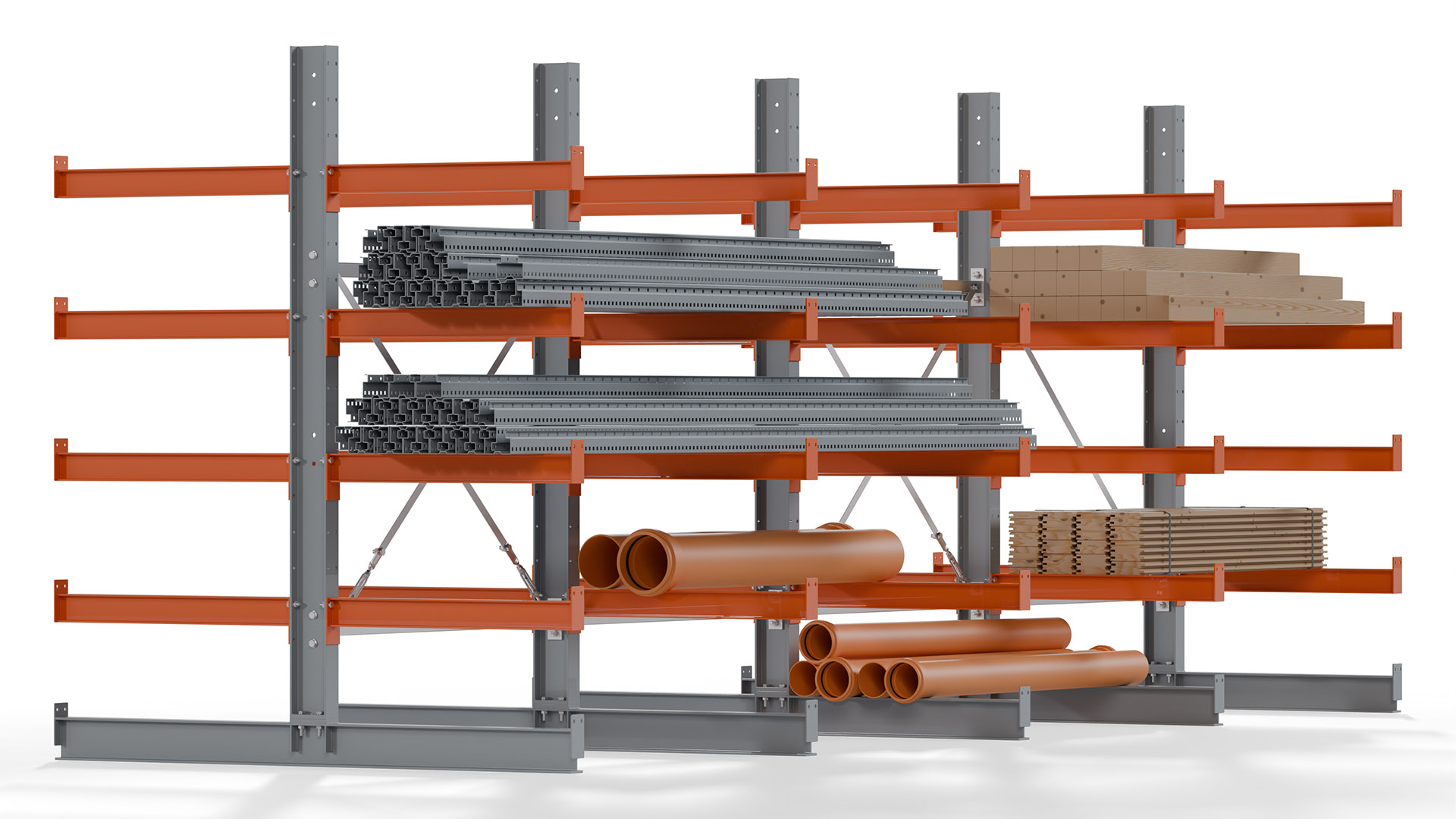 Das Kragarmregal zeichnet sich durch eine beständige und widerstandsfähige Konstruktion aus. Gefertigt aus hochwertigem Stahl, werden Einzelkomponenten wie Ständerprofile, Ständerfüße, Kragarme und Ständerverbindungen zu einem stabilen Gesamtsystem verschraubt. Die sandgestrahlte Oberfläche der Stahlprofile ist in einem elektrostatischen Verfahren mit Industrielack in Silbergrau (RAL 7001) und Reinorange (RAL 2004) beschichtet.