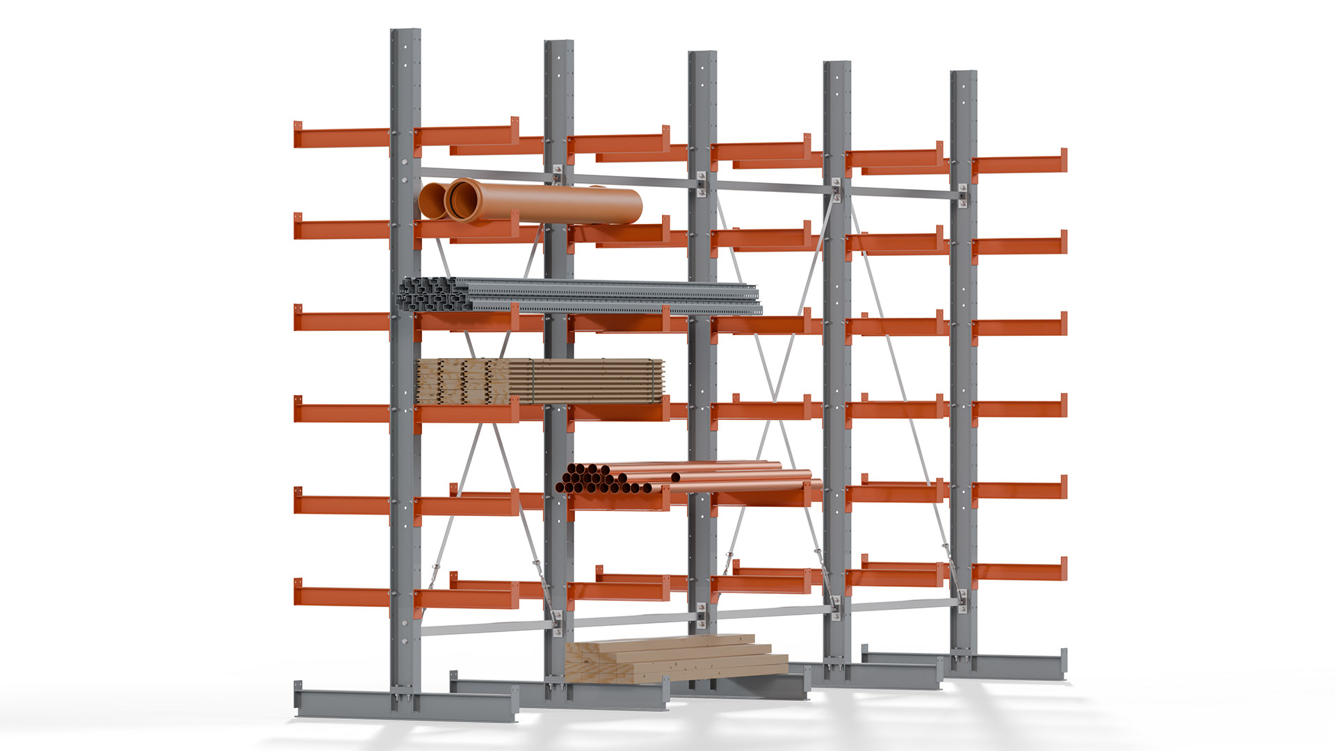 Das Kragarmregal zeichnet sich durch eine beständige und widerstandsfähige Konstruktion aus. Gefertigt aus hochwertigem Stahl, werden Einzelkomponenten wie Ständerprofile, Ständerfüße, Kragarme und Ständerverbindungen zu einem stabilen Gesamtsystem verschraubt. Die sandgestrahlte Oberfläche der Stahlprofile ist in einem elektrostatischen Verfahren mit Industrielack in Silbergrau (RAL 7001) und Reinorange (RAL 2004) beschichtet.