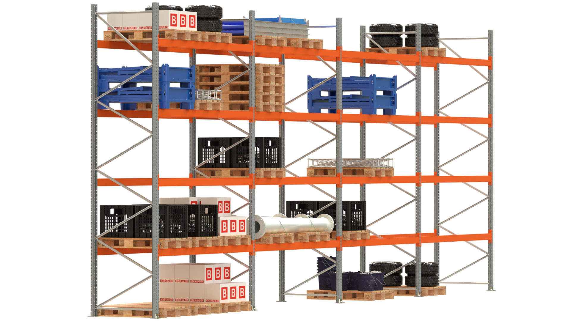 Palettenregal ARTUS - Breite 1122,5 cm - Höhe 450 cm - Tiefe 110 cm - 4 Träger-Ebenen - Fachlast 2000 kg - 60 Palettenstellplätze