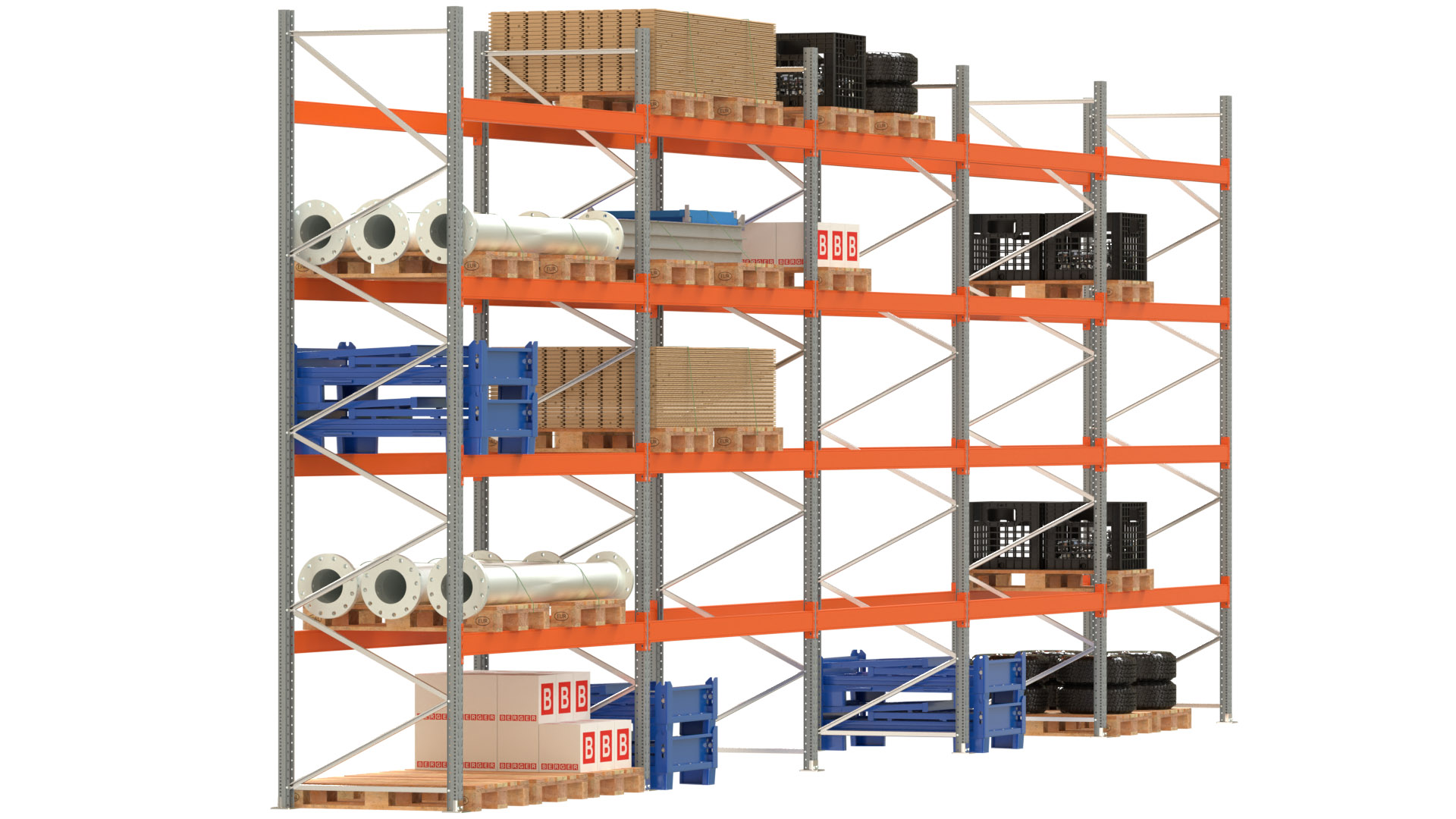 Palettenregal ARTUS - Breite 1401 cm - Höhe 450 cm - Tiefe 110 cm - 4 Träger-Ebenen - Fachlast 2700 kg - 75 Palettenstellplätze