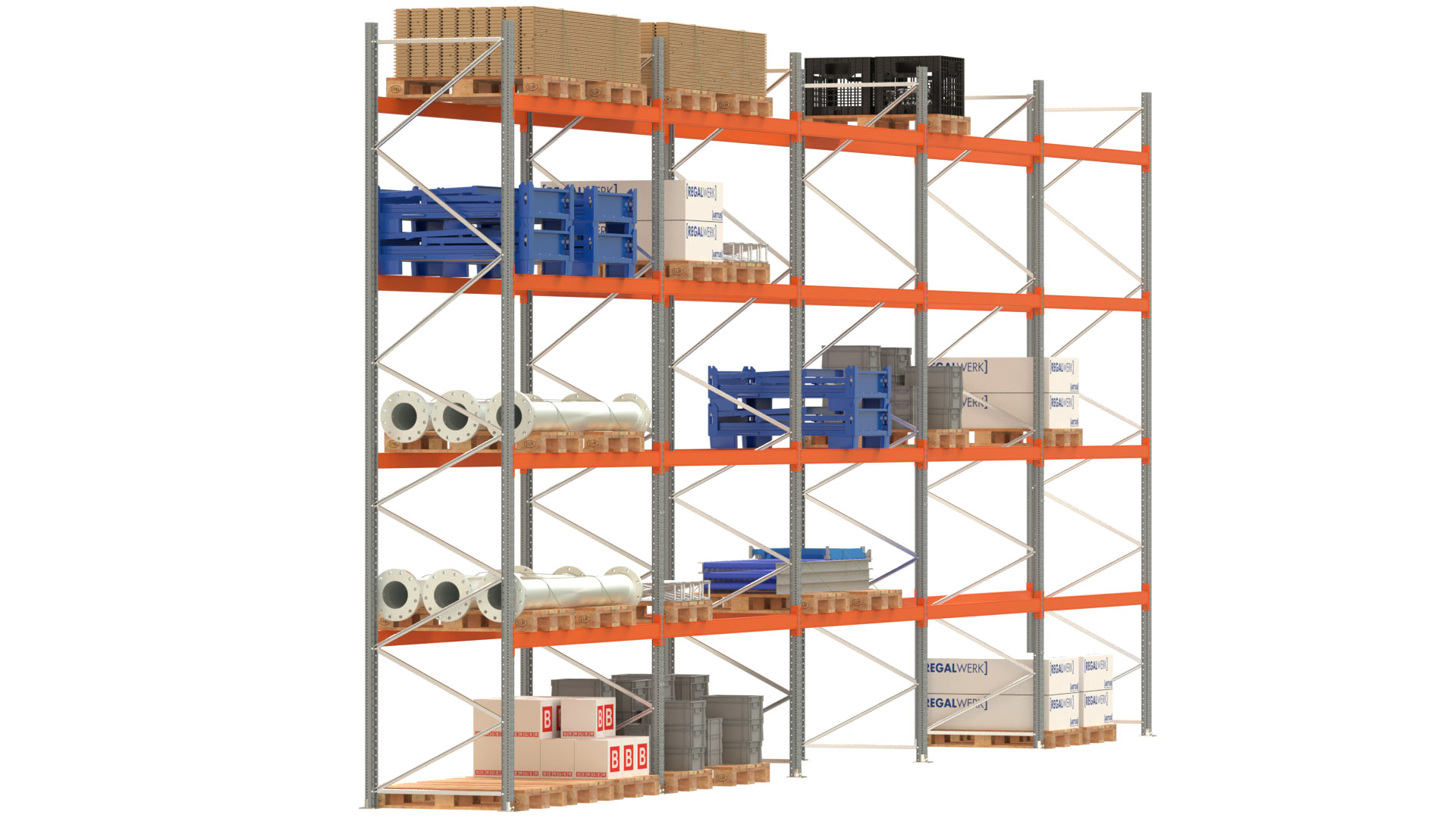 Durch ein optimal aufeinander abgestimmtes Programm an Regalkomponenten wie Stützrahmen, Auflageträger und viele andere Zubehörteile kann das Palettenregal individuell an unterschiedliches Lagergut und räumliche Gegebenheiten angepasst und jederzeit auch erweitert werden.