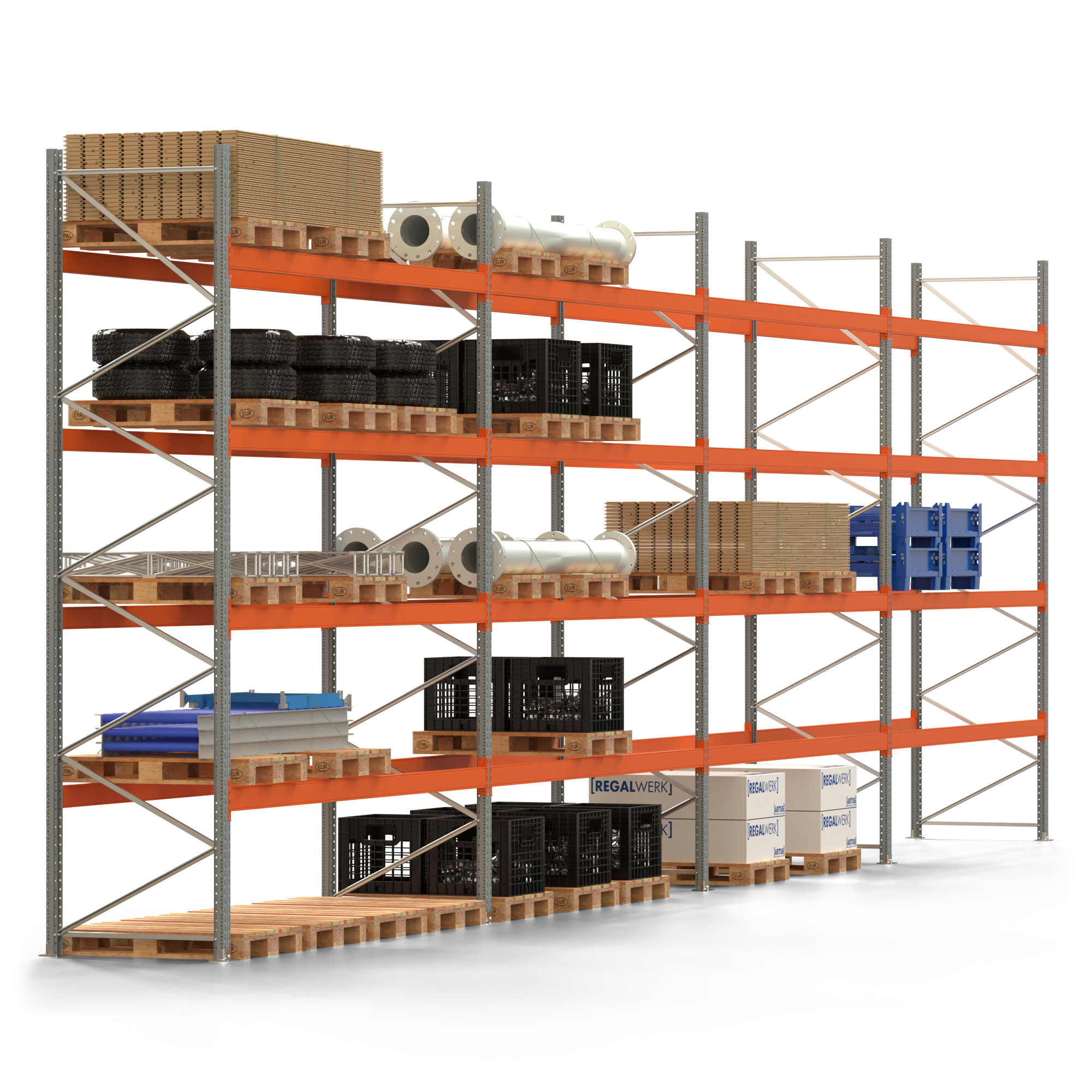 Palettenregal ARTUS - Breite 1482,5 cm - Höhe 450 cm - Tiefe 110 cm - 4 Träger-Ebenen - Fachlast 2400 kg - 80 Palettenstellplätze