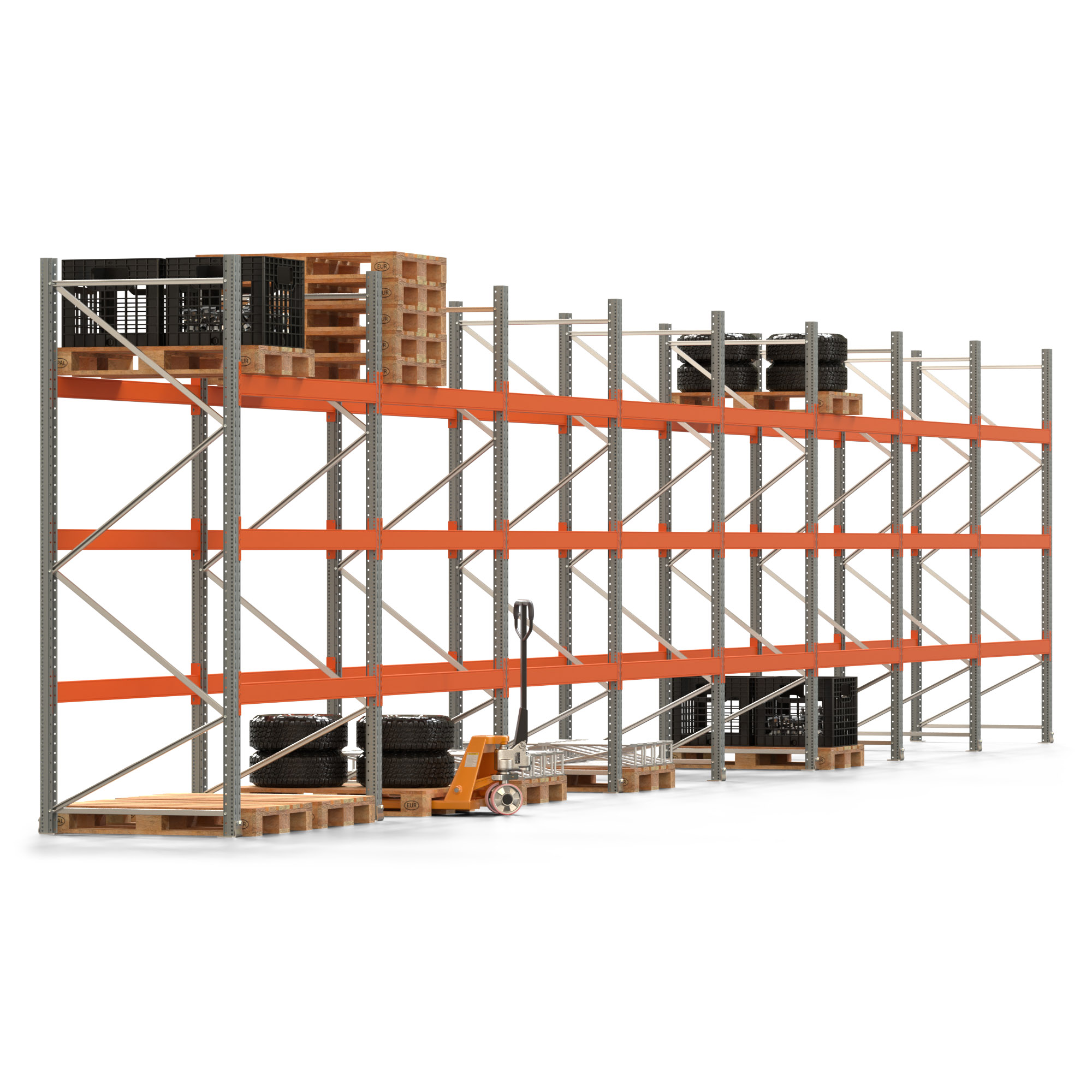 Palettenregal ARTUS - Breite 1596,5 cm - Höhe 300 cm - Tiefe 110 cm - 3 Träger-Ebenen - Fachlast 2000 kg - 64 Palettenstellplätze