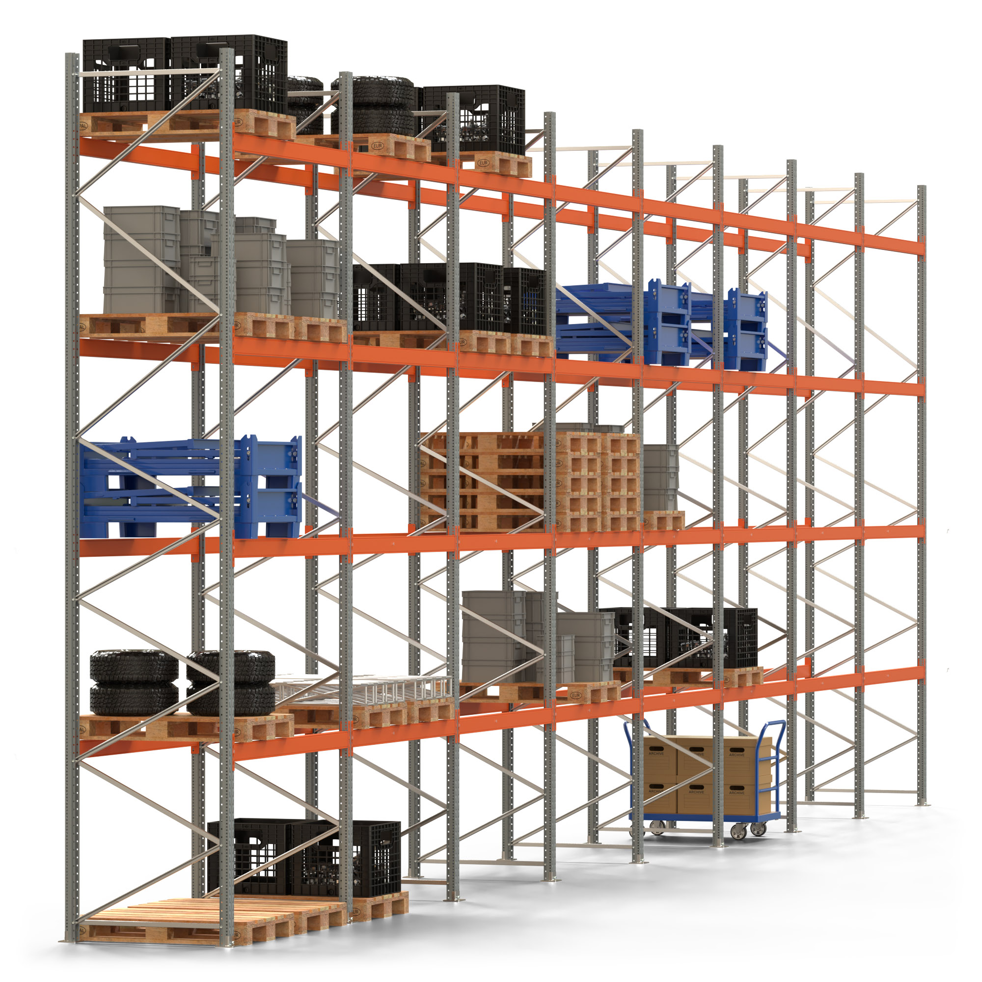 Palettenregal ARTUS - Breite 1596,5 cm - Höhe 550 cm - Tiefe 110 cm - 4 Träger-Ebenen - Fachlast 2000 kg - 80 Palettenstellplätze