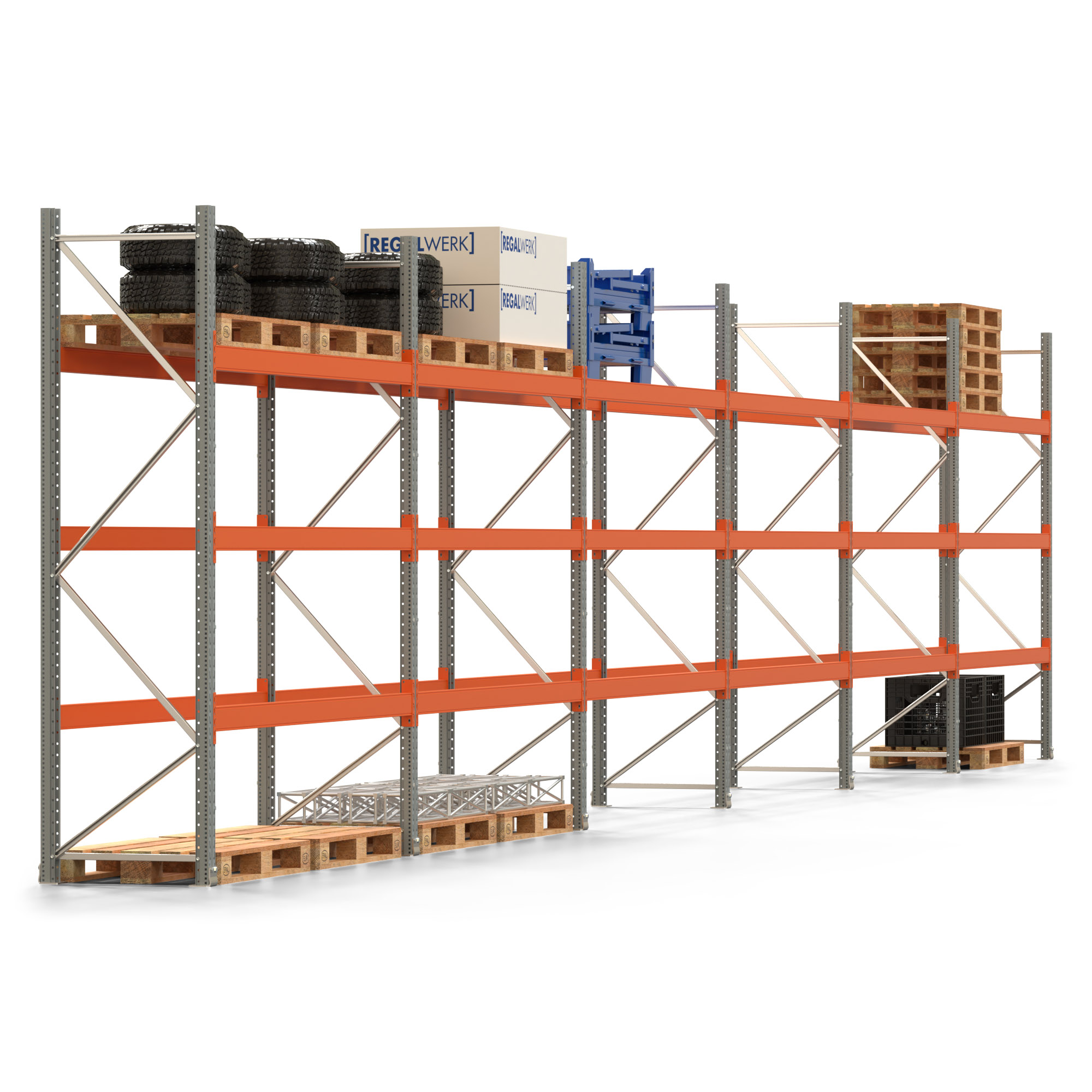 Palettenregal ARTUS - Breite 1679,5 cm - Höhe 300 cm - Tiefe 80 cm - 3 Träger-Ebenen - Fachlast 2000 kg - 48 Palettenstellplätze