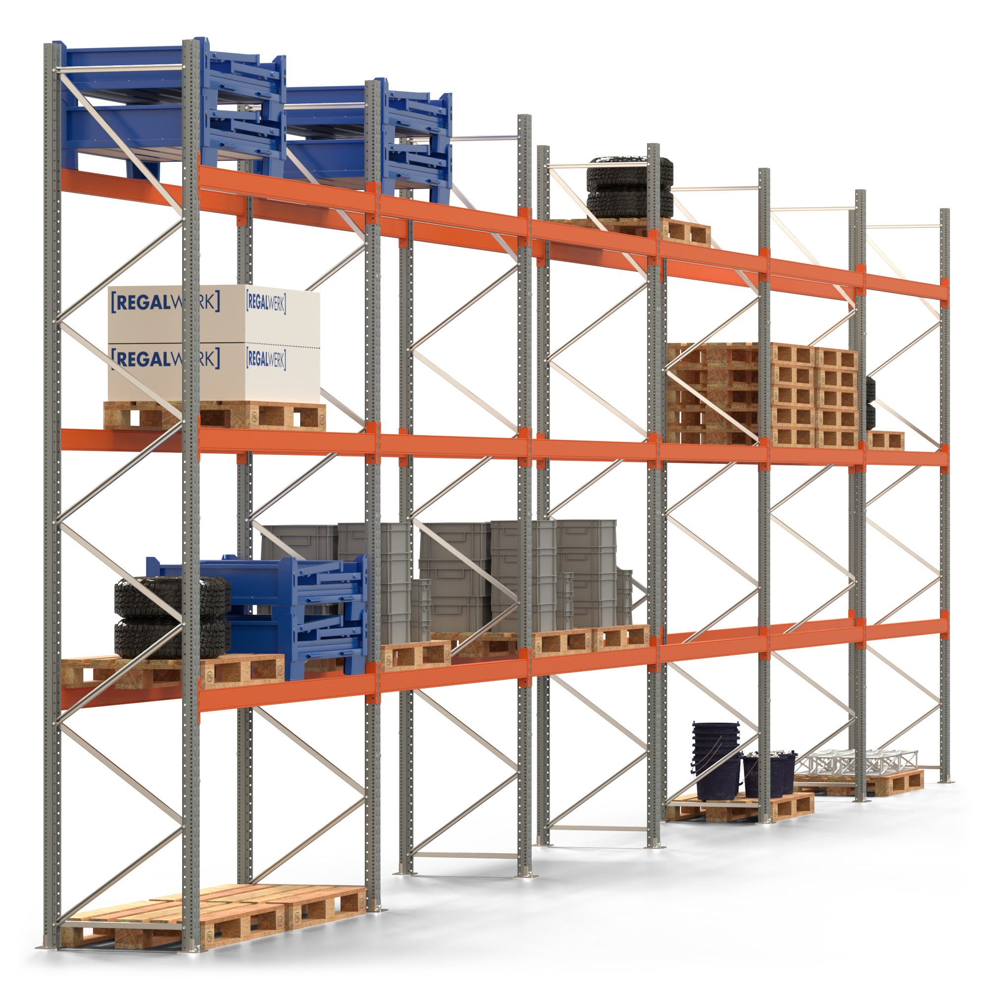 Palettenregal ARTUS - Breite 1679,5 cm - Höhe 450 cm - Tiefe 80 cm - 3 Träger-Ebenen - Fachlast 2000 kg - 48 Palettenstellplätze