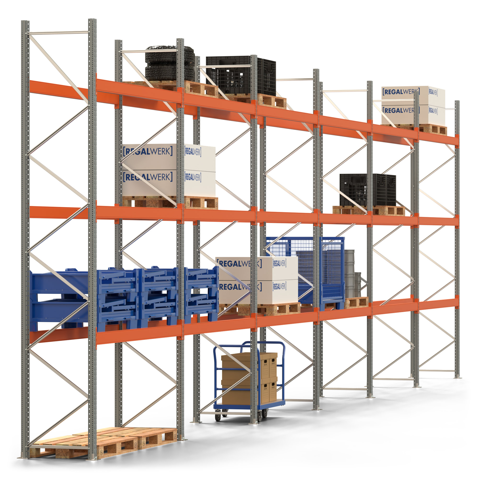 Palettenregal ARTUS - Breite 1679,5 cm - Höhe 450 cm - Tiefe 80 cm - 3 Träger-Ebenen - Fachlast 2910 kg - 48 Palettenstellplätze