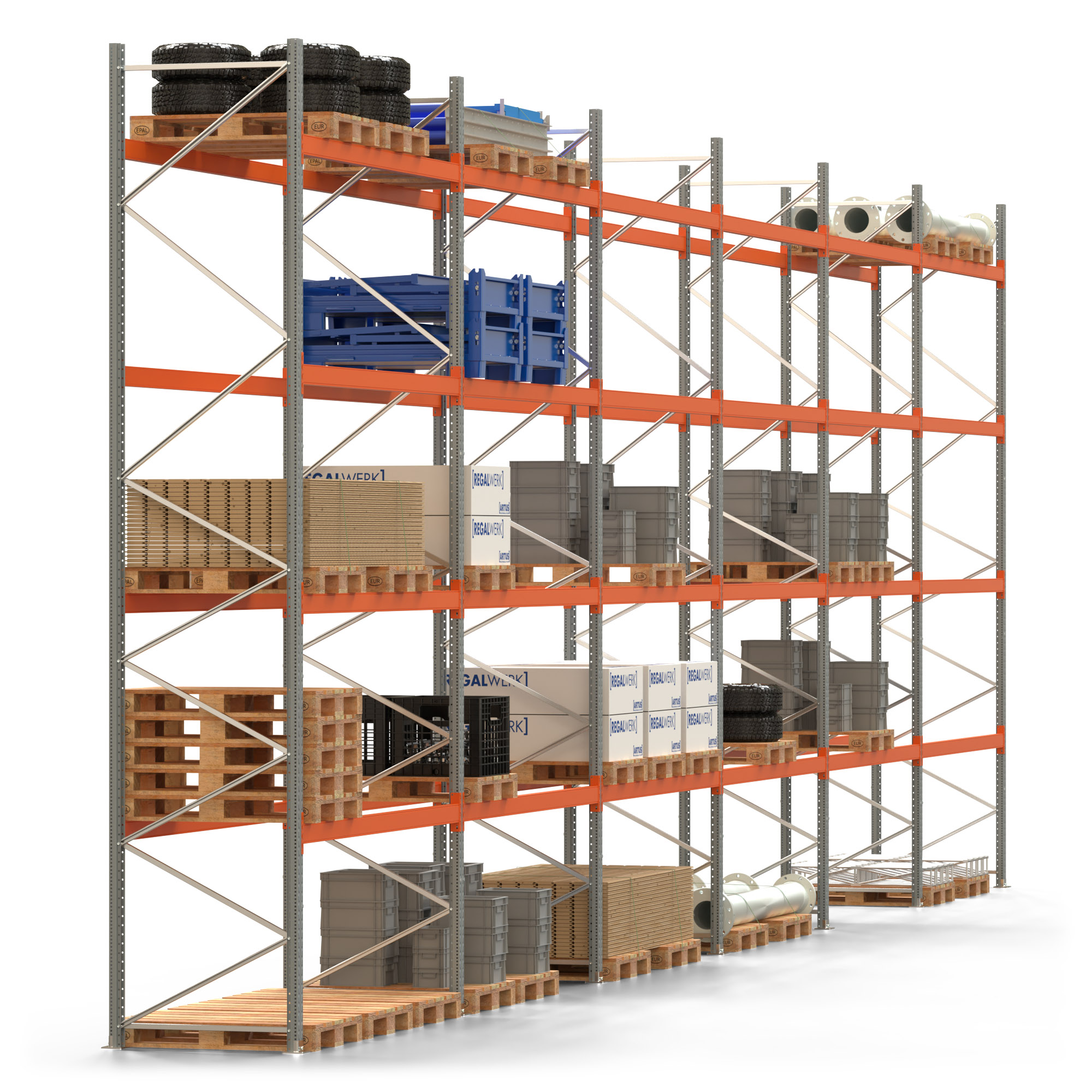 Palettenregal ARTUS - Breite 1679,5 cm - Höhe 550 cm - Tiefe 110 cm - 4 Träger-Ebenen - Fachlast 2000 kg - 90 Palettenstellplätze