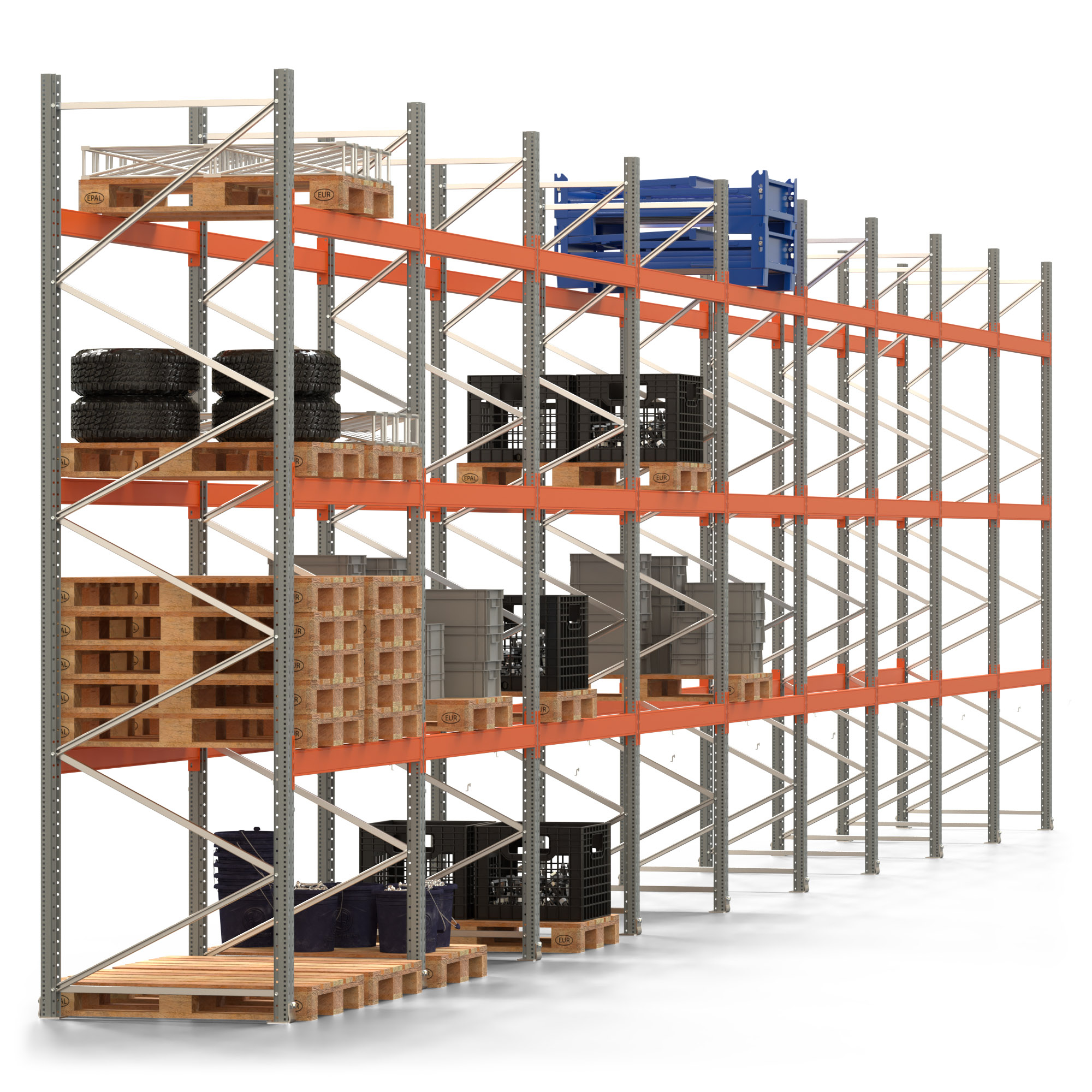 Palettenregal ARTUS - Breite 1795 cm - Höhe 400 cm - Tiefe 110 cm - 3 Träger-Ebenen - Fachlast 2000 kg - 72 Palettenstellplätze