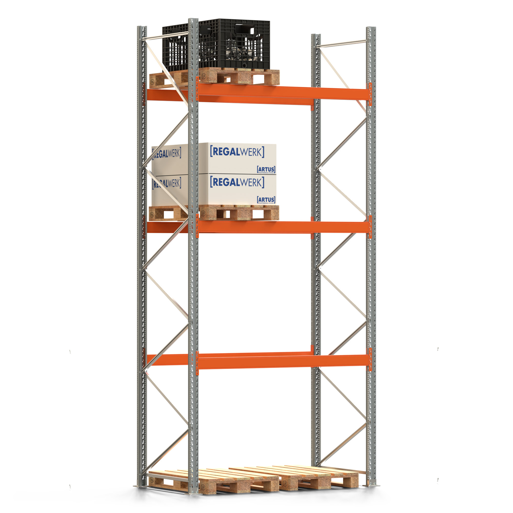 Palettenregal ARTUS - Breite 207 cm - Höhe 450 cm - Tiefe 110 cm - 3 Träger-Ebenen - Fachlast 2000 kg - 8 Palettenstellplätze