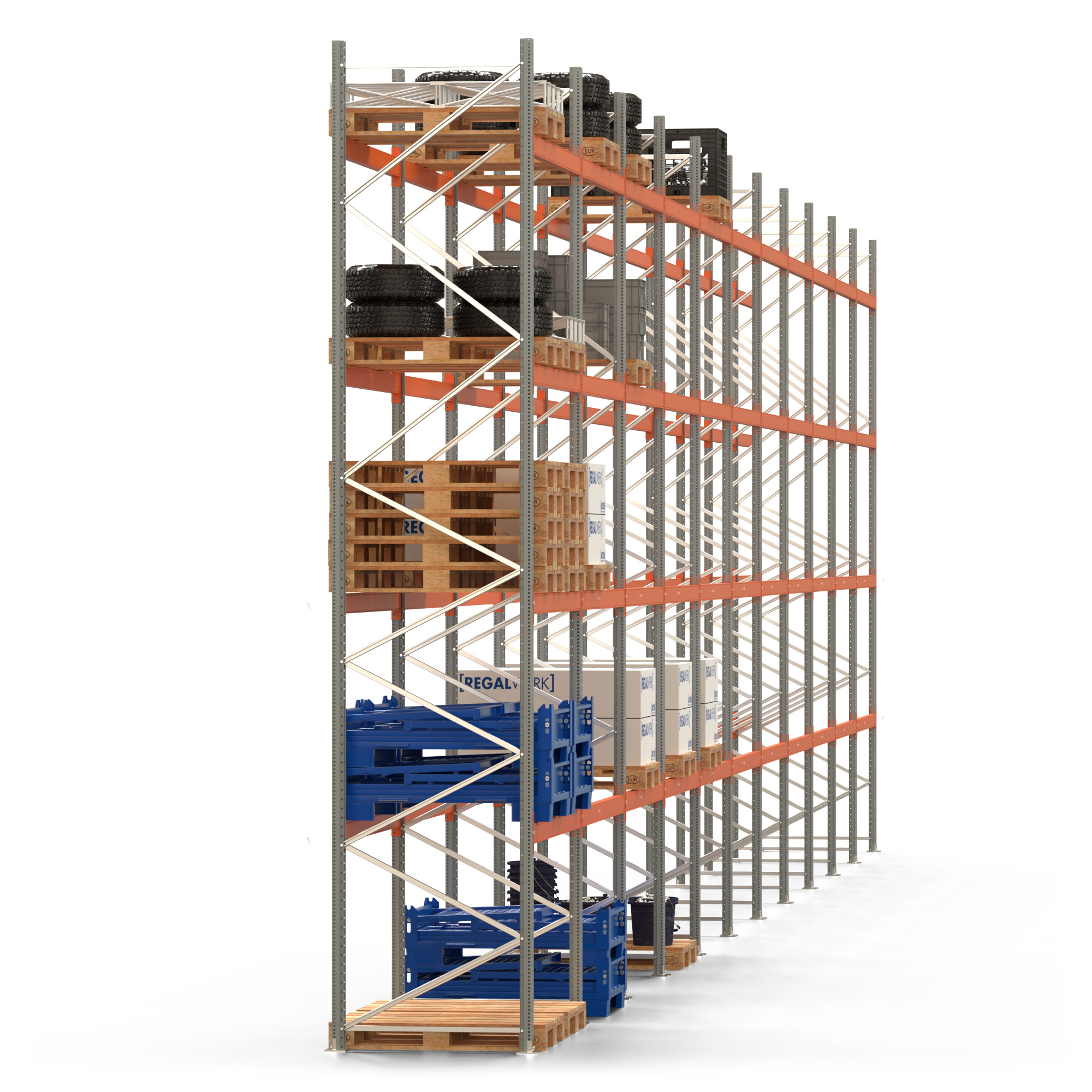 Palettenregal ARTUS - Breite 2192 cm - Höhe 550 cm - Tiefe 110 cm - 4 Träger-Ebenen - Fachlast 2000 kg - 110 Palettenstellplätze
