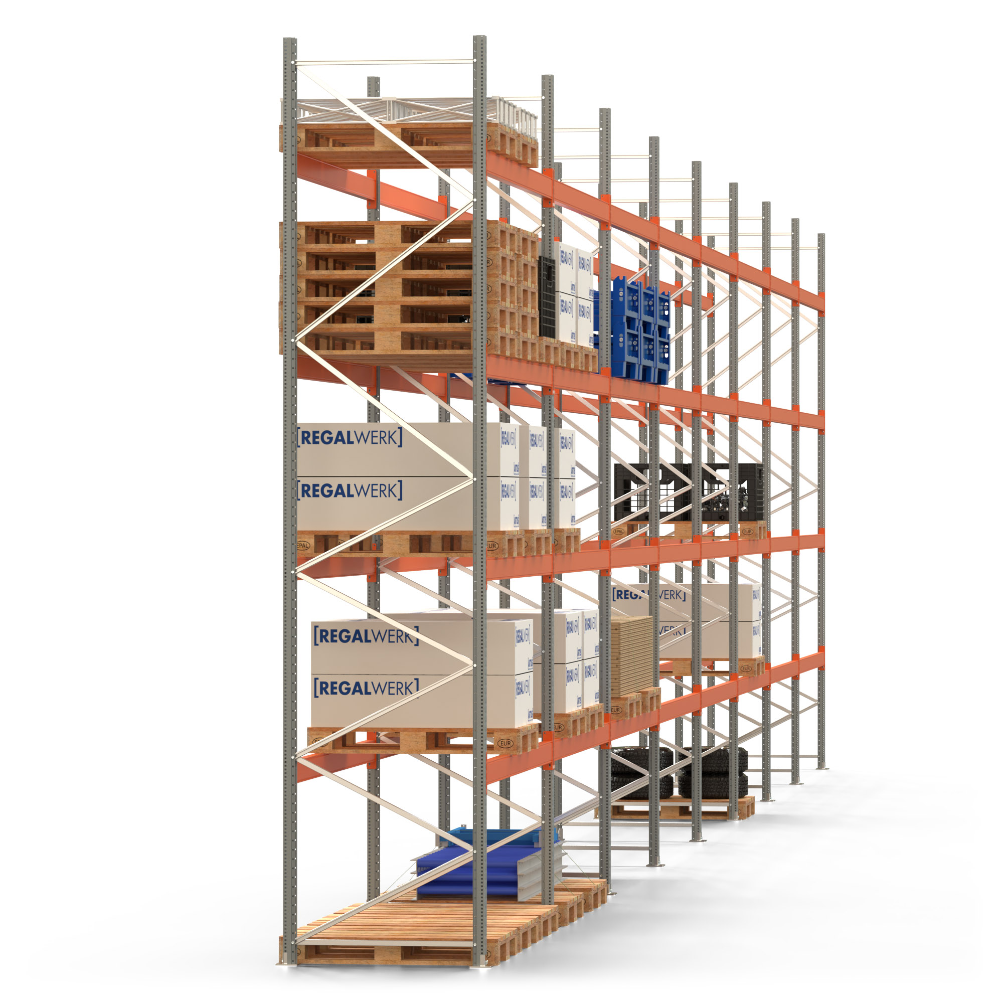 Palettenregal ARTUS - Breite 2236,5 cm - Höhe 500 cm - Tiefe 110 cm - Fachlast 2250 kg - 120 Palettenstellplätze