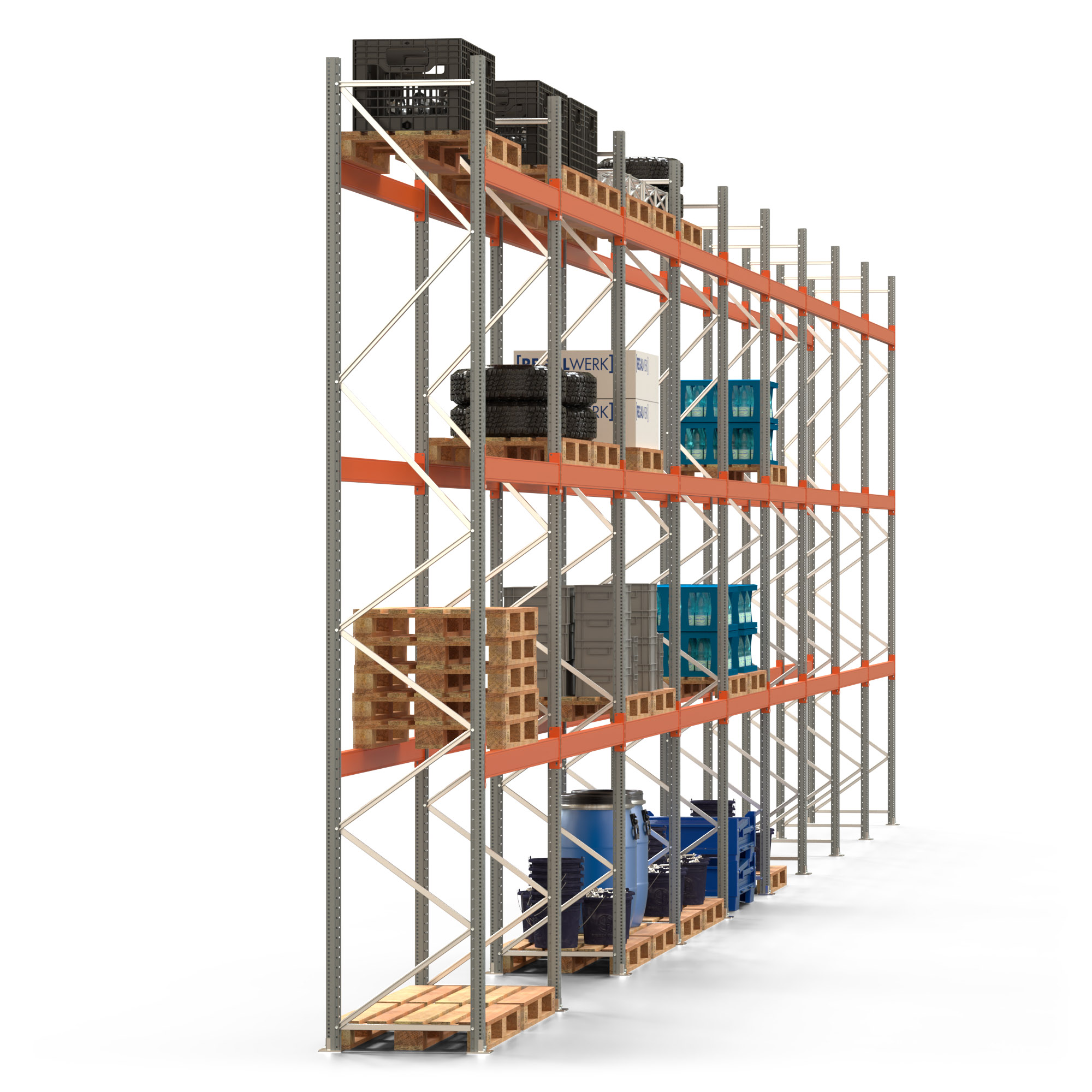 Palettenregal ARTUS - Breite 2515 cm - Höhe 500 cm - Tiefe 80 cm - 3 Träger-Ebenen - Fachlast 3000 kg - 72 Palettenstellplätze