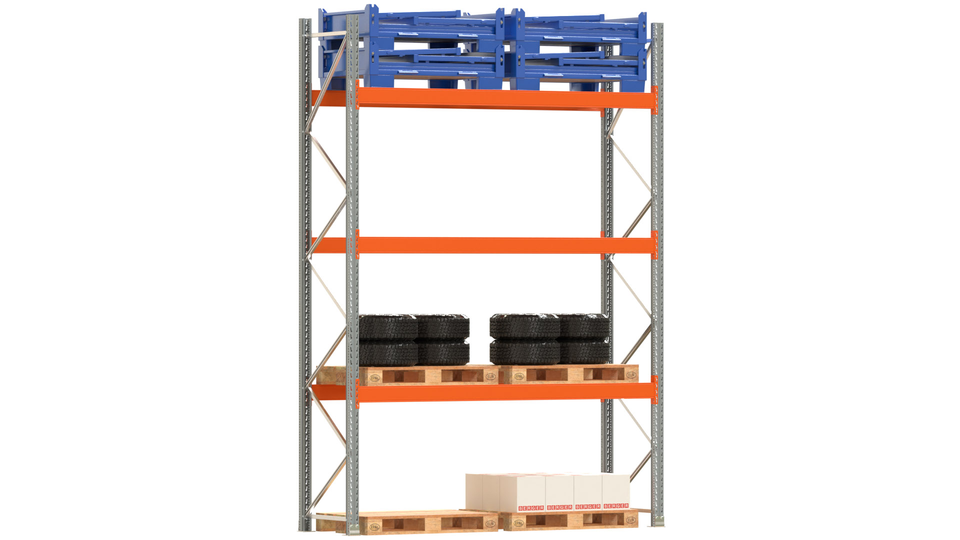 Palettenregal ARTUS - Breite 287 cm - Höhe 400 cm - Tiefe 80 cm - 3 Träger-Ebenen - Fachlast 2910 kg - 8 Palettenstellplätze