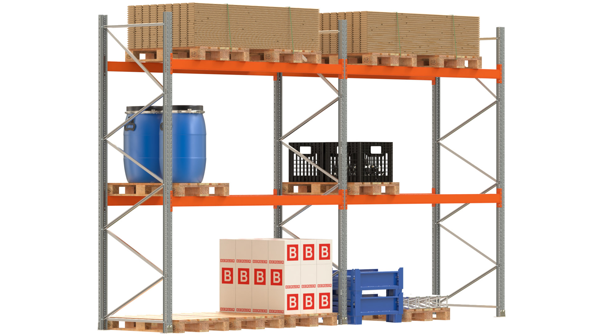 Palettenregal ARTUS - Breite 565,5 cm - Höhe 350 cm - Tiefe 110 cm - 2 Träger-Ebenen - Fachlast 2000 kg - 18 Palettenstellplätze