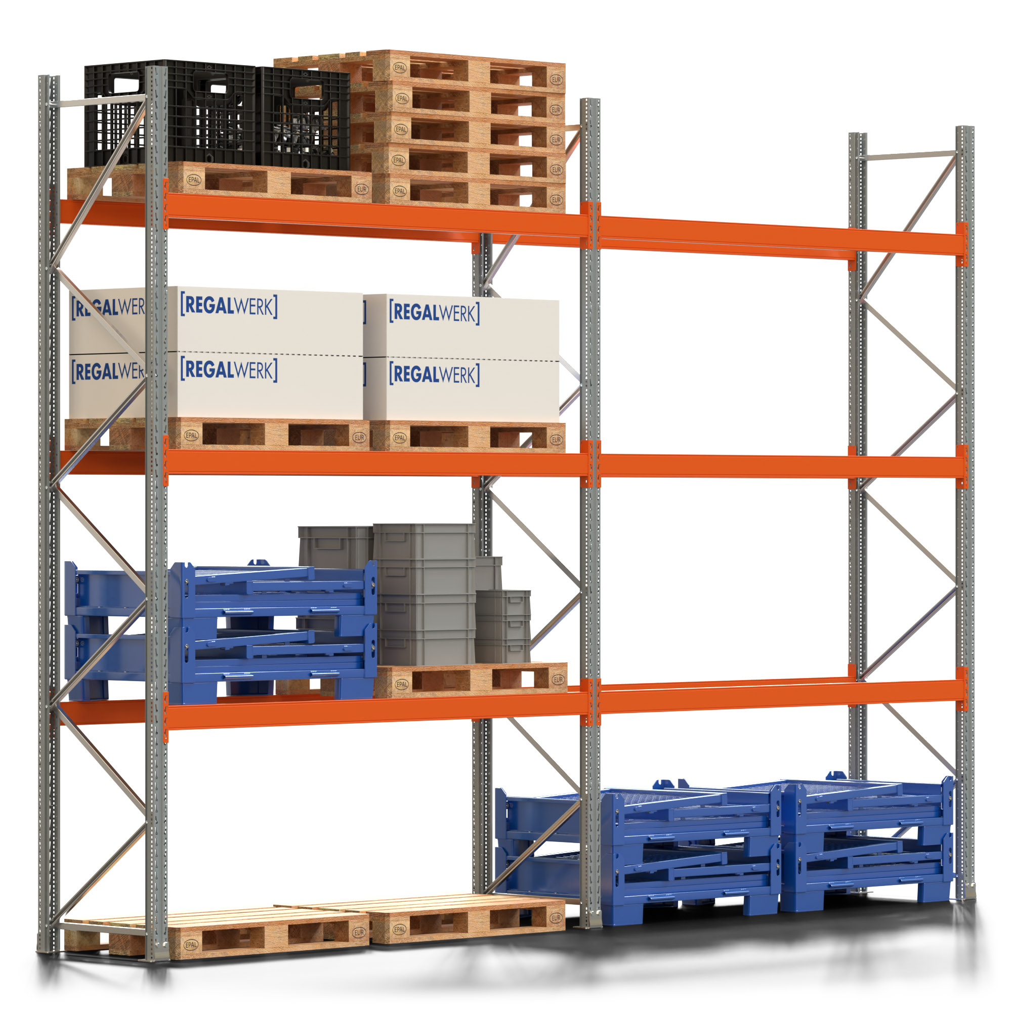 Palettenregal ARTUS - Breite 565,5 cm - Höhe 400 cm - Tiefe 80 cm - 3 Träger-Ebenen - Fachlast 2000 kg - 16 Palettenstellplätze