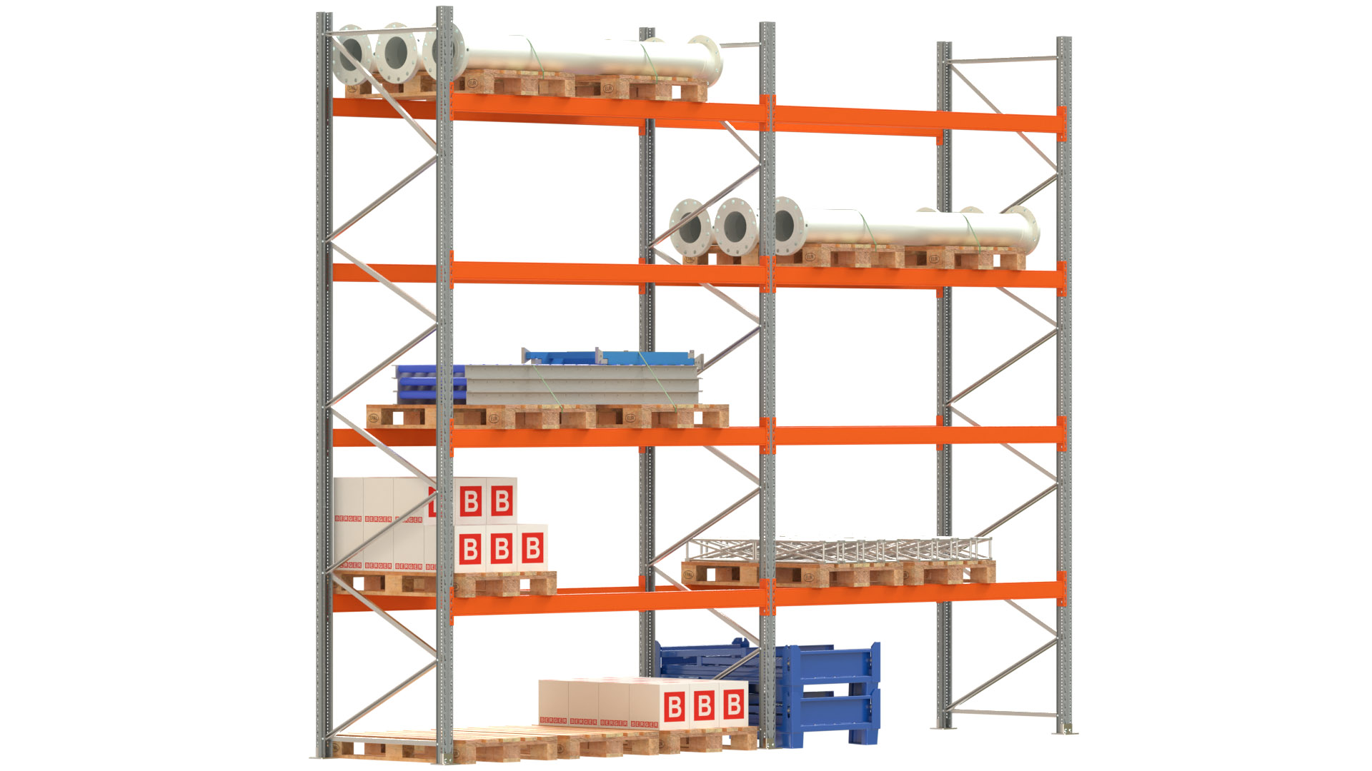 Palettenregal ARTUS - Breite 565,5 cm - Höhe 450 cm - Tiefe 110 cm - 4 Träger-Ebenen - Fachlast 2325 kg - 30 Palettenstellplätze