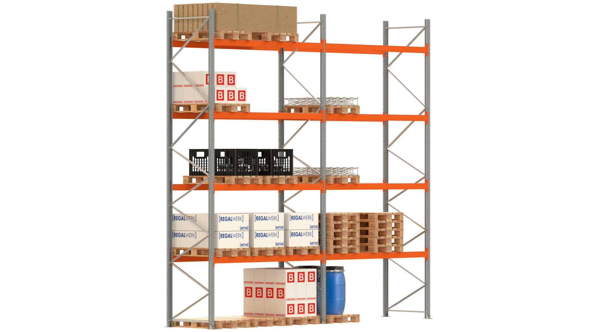 Palettenregal ARTUS - Breite 565,5 cm - Höhe 550 cm - Tiefe 110 cm - 4 Träger-Ebenen - Fachlast 2000 kg - 30 Palettenstellplätze