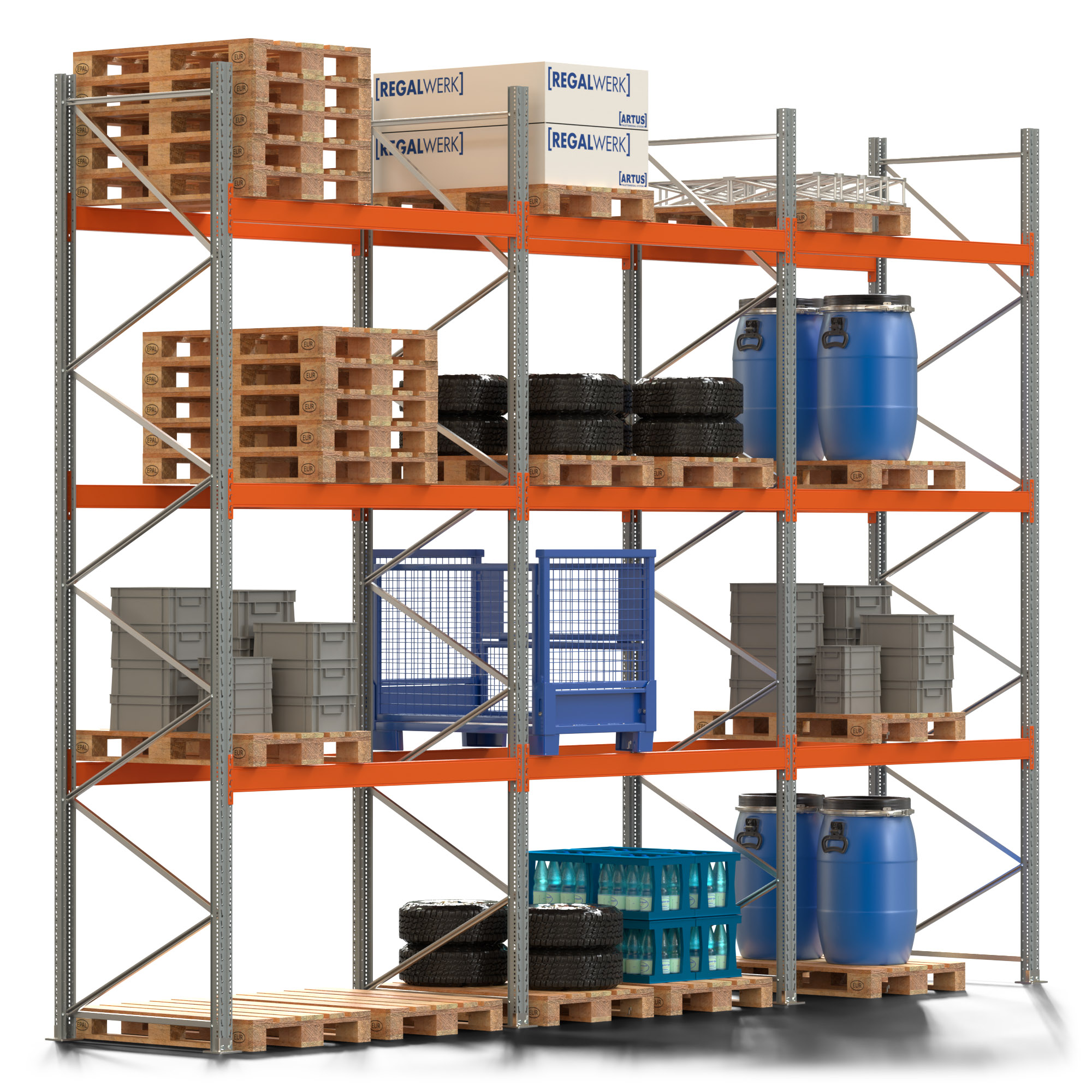 Palettenregal ARTUS - Breite 604 cm - Höhe 450 cm - Tiefe 110 cm - 3 Träger-Ebenen - Fachlast 2000 kg - 24 Palettenstellplätze