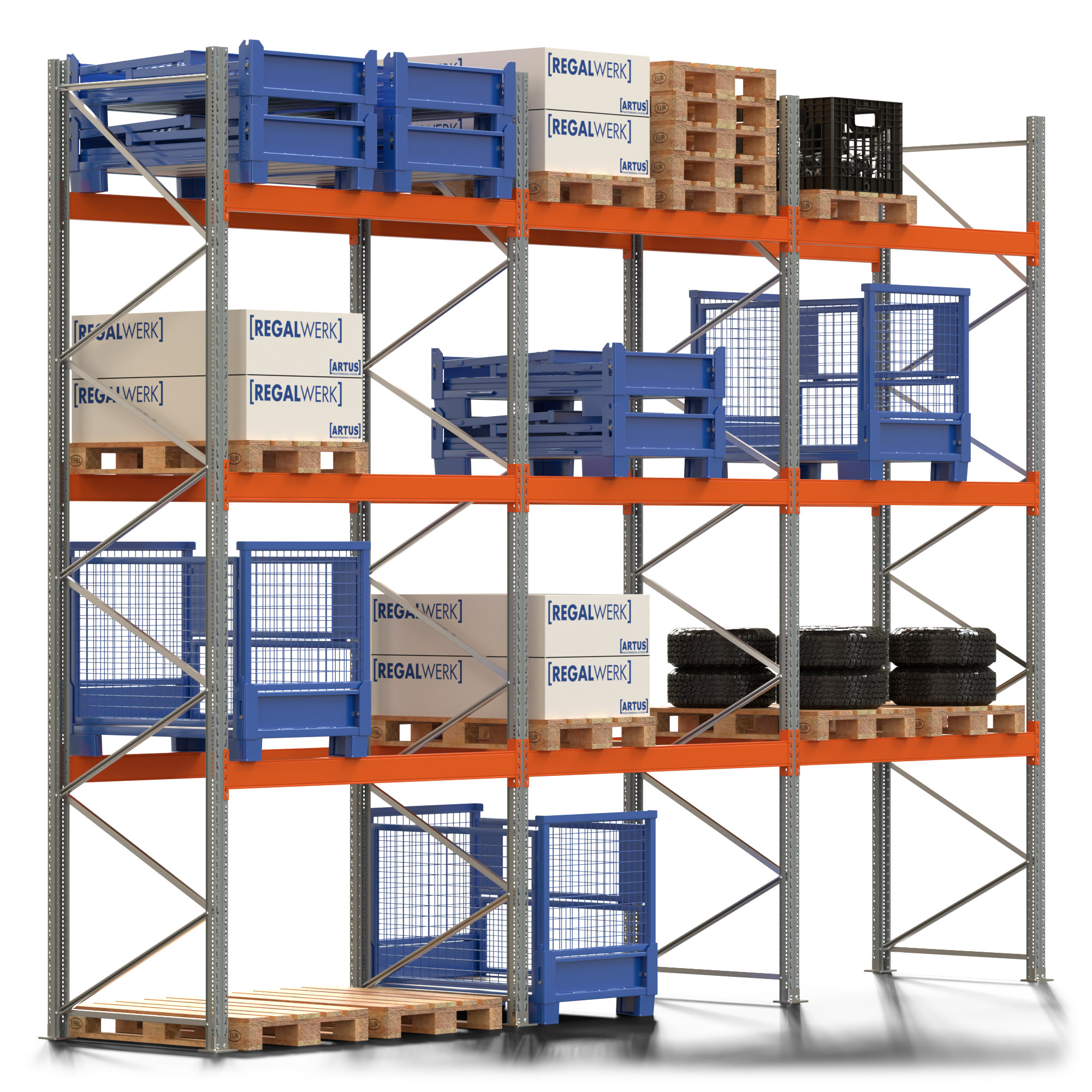 Palettenregal ARTUS - Breite 604 cm - Höhe 450 cm - Tiefe 110 cm - 3 Träger-Ebenen - Fachlast 3000 kg - 24 Palettenstellplätze