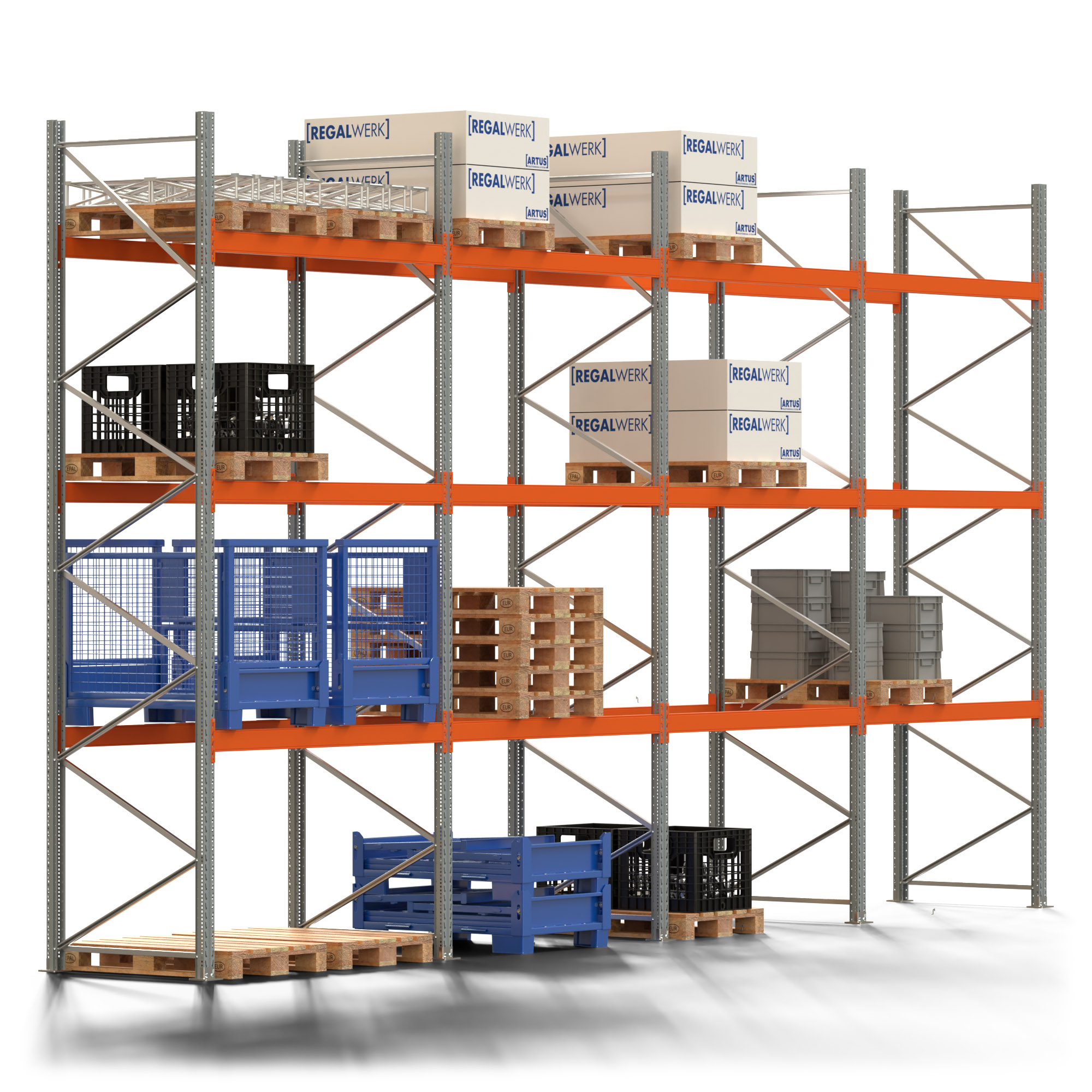 Palettenregal ARTUS - Breite 802,5 cm - Höhe 450 cm - Tiefe 110 cm - 3 Träger-Ebenen - Fachlast 2000 kg - 32 Palettenstellplätze