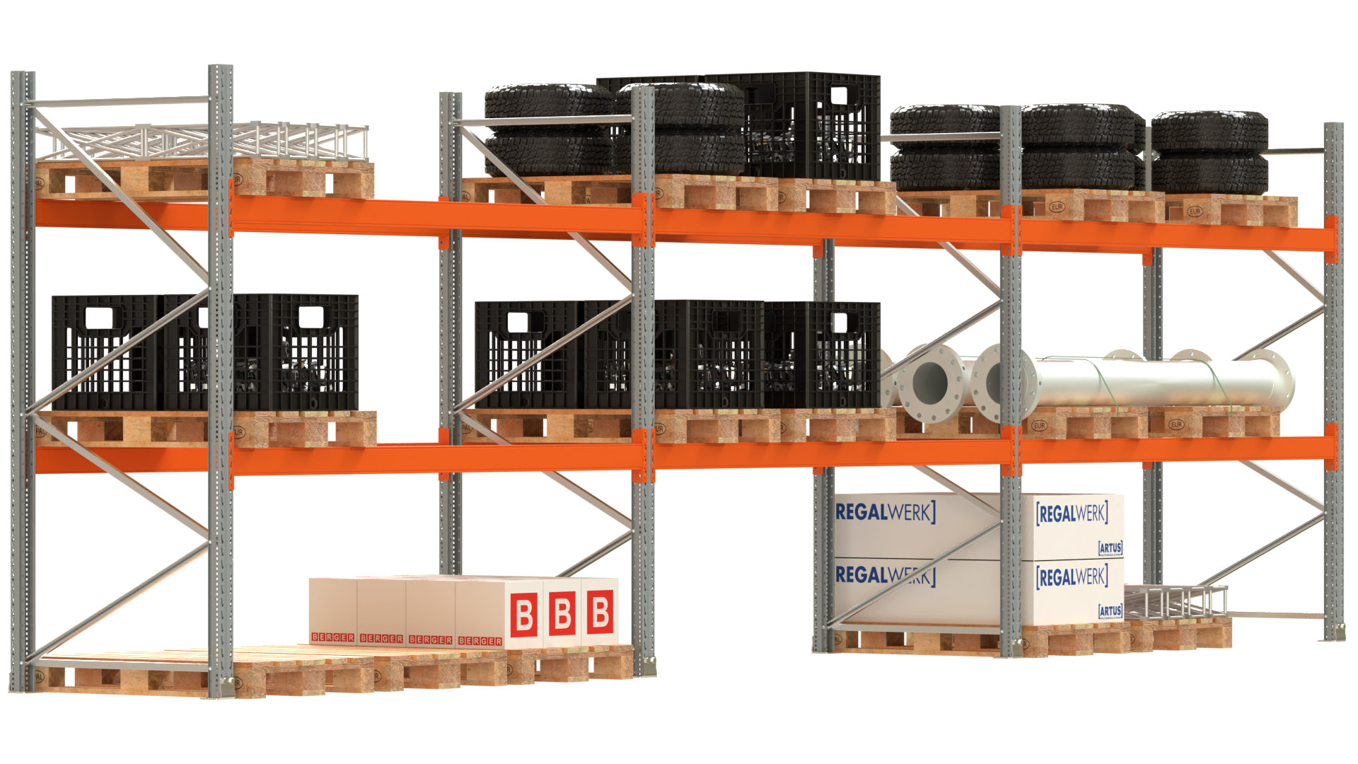 Palettenregal ARTUS - Breite 844 cm - Höhe 250 cm - Tiefe 110 cm - 2 Träger-Ebenen - Fachlast 2000 kg - 27 Palettenstellplätze