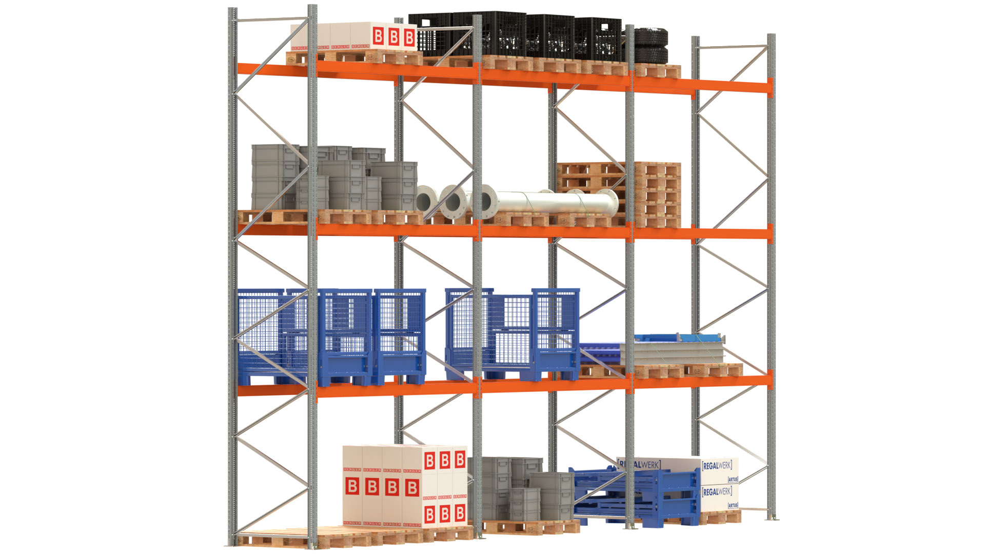 Palettenregal ARTUS - Breite 844 cm - Höhe 550 cm - Tiefe 110 cm - 3 Träger-Ebenen - Fachlast 2000 kg - 36 Palettenstellplätze