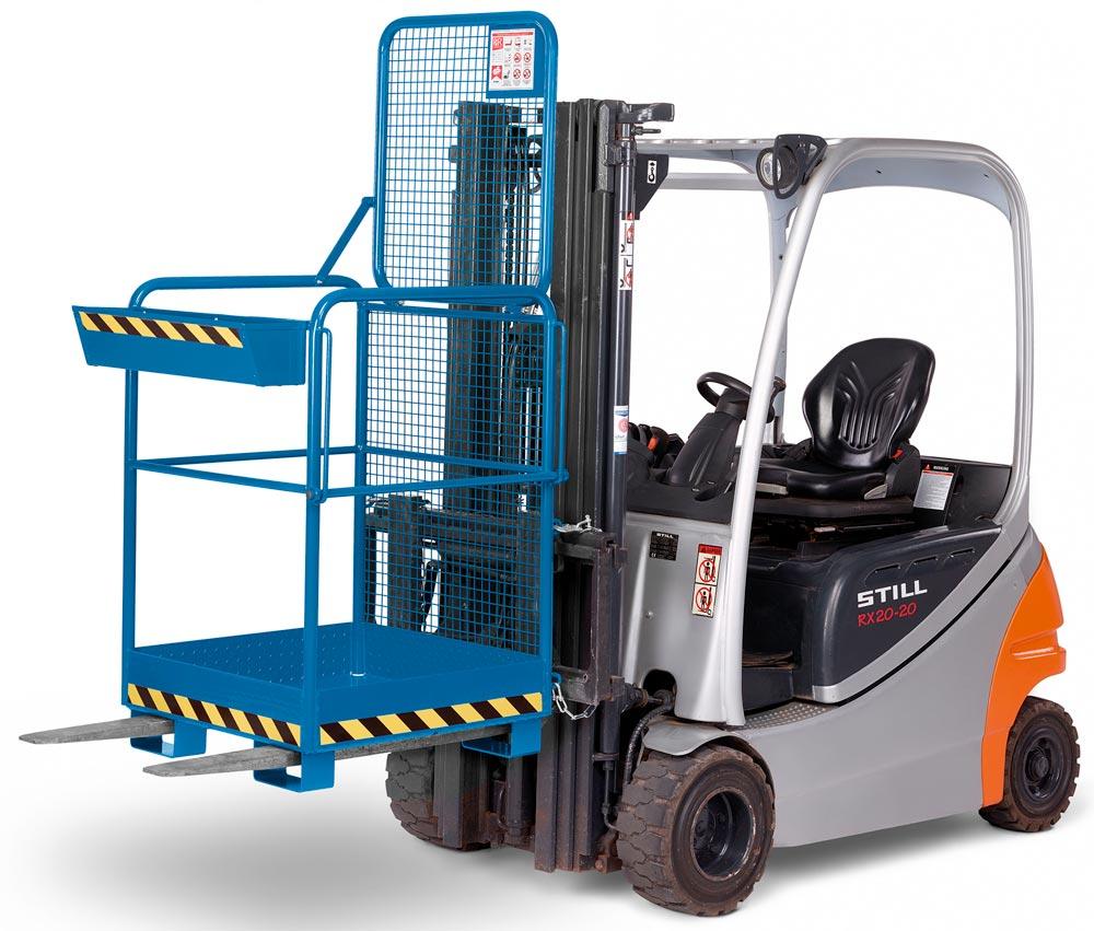 · TÜV geprüfte Sicherheit, entsprechend der DGUV (Deutsche gesetzliche Unfallversicherung) · Stabile Stahlkonstruktion mit rundum Absturzsicherung aus Rohr gemäß UVV · Arbeitskörbe mit TÜV-Zulassung für 2 Personen · Arbeitsplattform aus rutschsicherer Tränenblechkonstruktion mit Abrollschutz · Steckbolzensicherung verhindert das Abrutschen von den Gabelzinken · Pulverbeschichtet · Verzinkte Ausführung auf Anfrage lieferbar